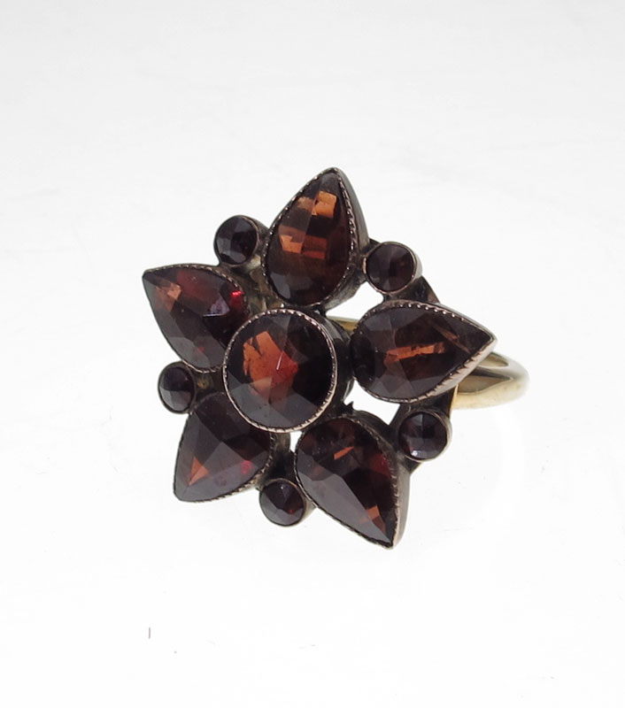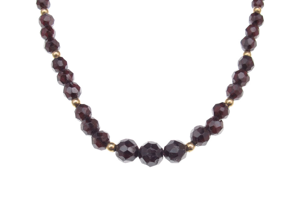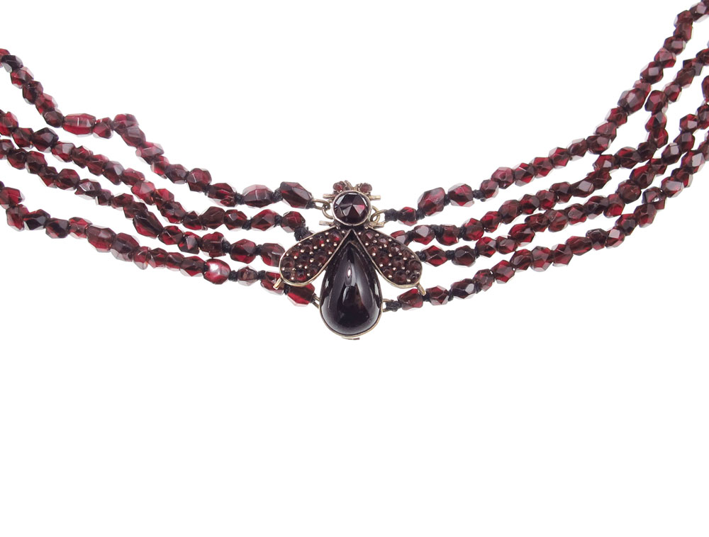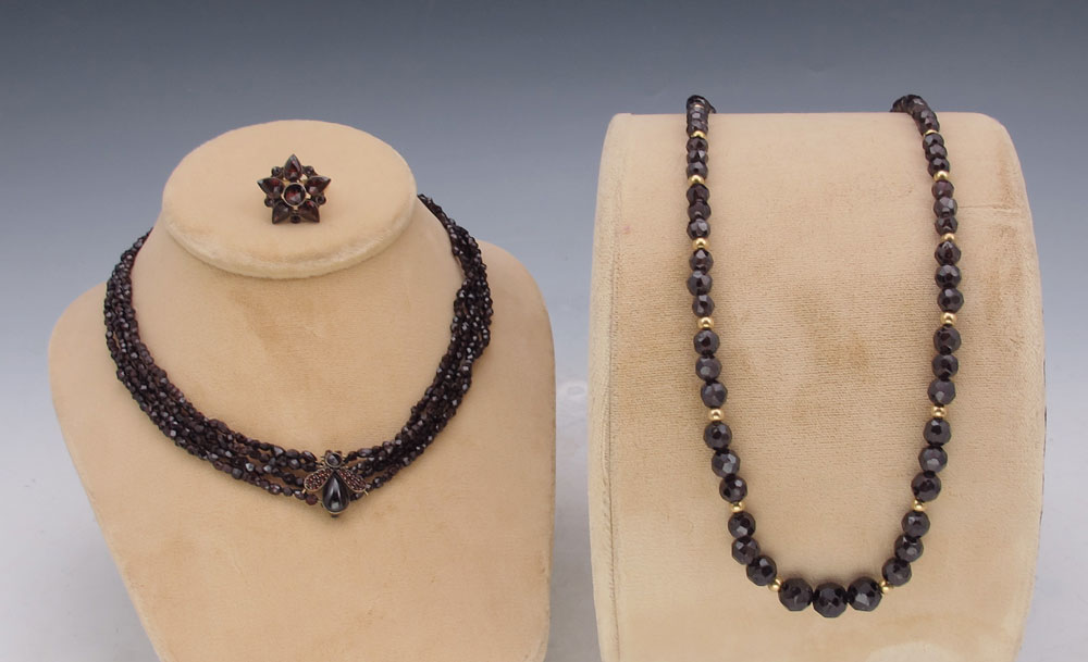 3 PIECE GROUP OF GARNET JEWELRY: 1) A four strand garnet bead necklace with figural fly bug clasp, beads are approx. 3 mm., necklace 16''l. 1) Faceted garnet bead 23'' necklace, beads approx. 7mm. 3) Flower form ring, size 5.5.