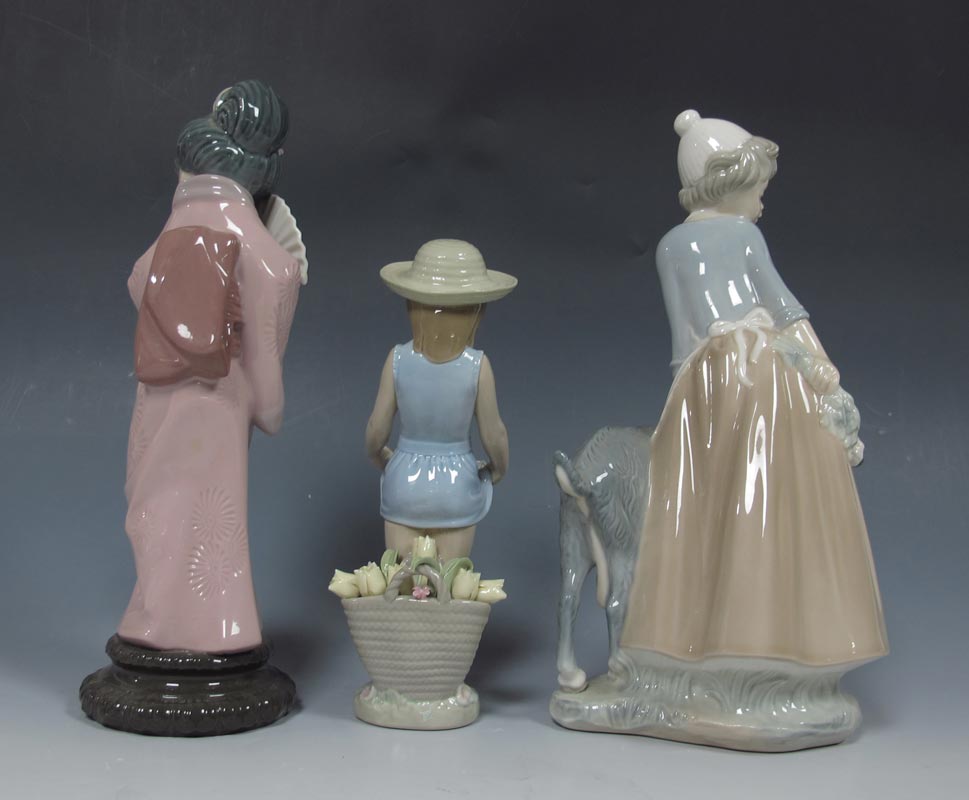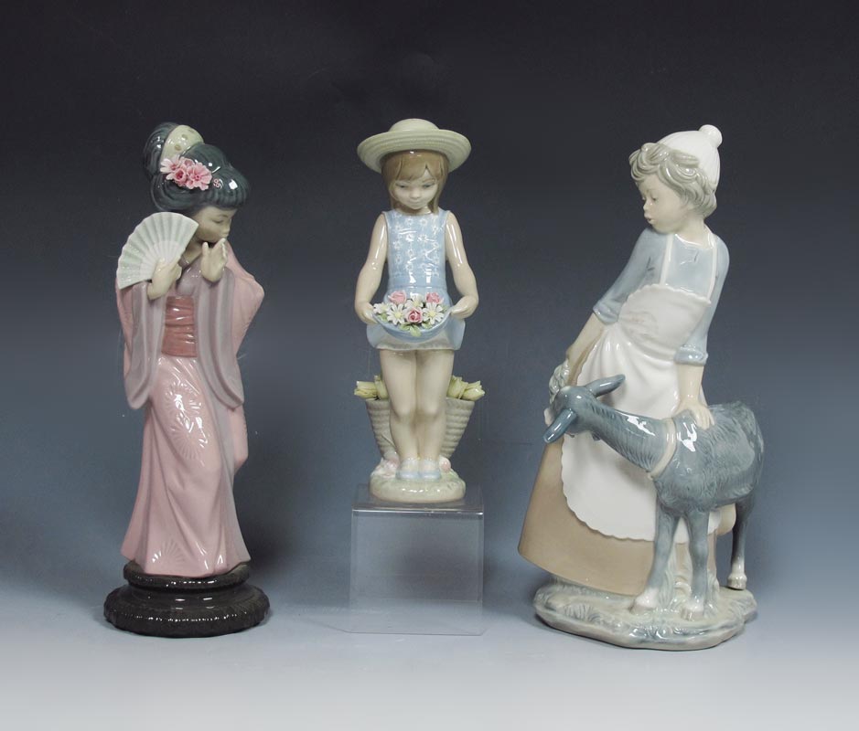 3 LLADRO & NAO FIGURINES: Geisha Girl with fan, marked LLadro Hand Made in Spain, 12''h., broken flower petal(s); Little girl with flowers and basket of yellow tulips, marked LLadro Hand Made in Spain Daisa, 9'', tip off leaf here petal there; and large Girl with Goat, marked NAO Hand Made in Spain by LLadro Daisa 1977, 11 7/8''. Sold as a lot.