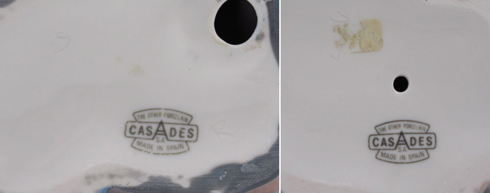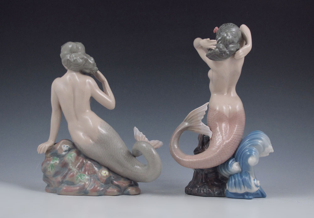 2 CASADES SPANISH PORCELAIN MERMAIDS: Nude mermaid figures on rocky outcrops, each with a pink flower in her hair, under glaze CasAdes stamps, 7 1/4''h. and 8 3/4''h.