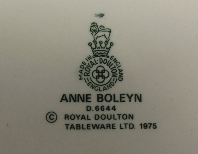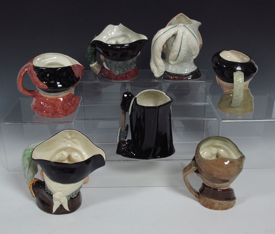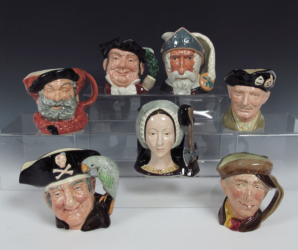 7 ROYAL DOULTON LARGE CHARACTER JUGS: ''Falstaff'' D6289, crazing; ''Mine Host'' D6468; ''Don Quixote'' D 6455; ''Monty'' D6202; ''Anne Boleyn D6644; ''Long John Silver'' D6335, factory flaw seam to bird's tail with tiny chip on inside; ''Arry'' RdNo 5194.
