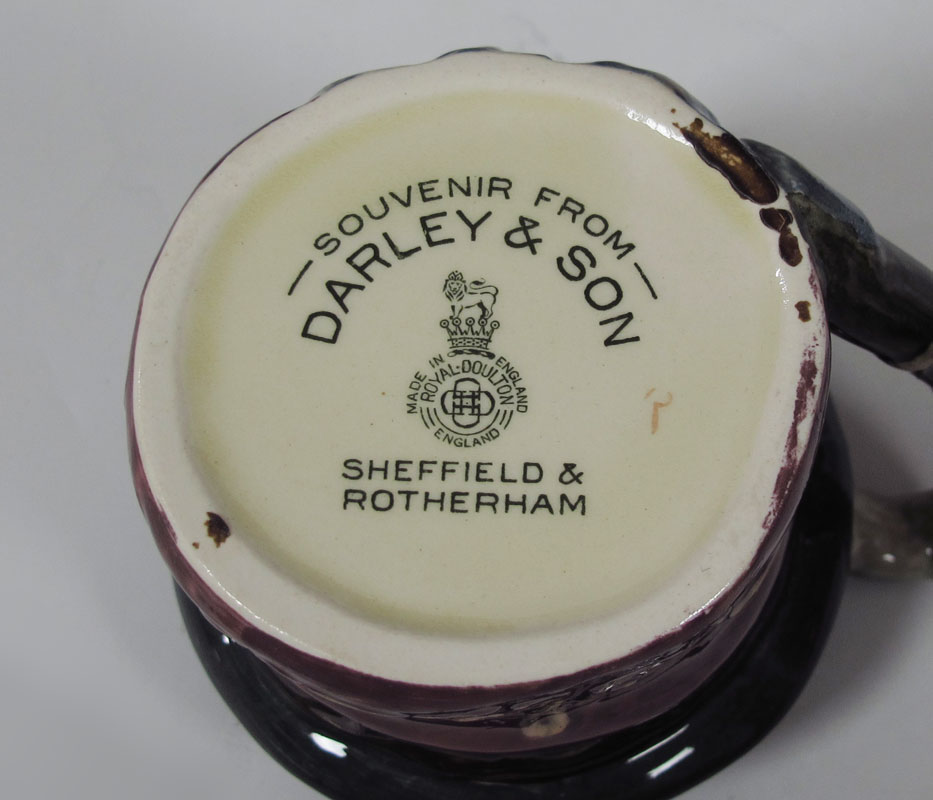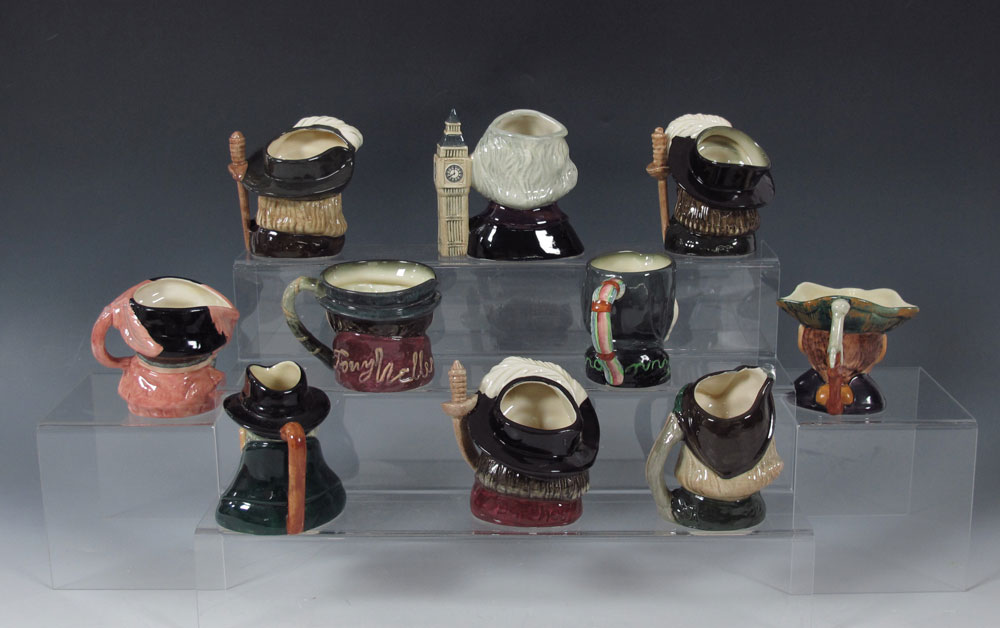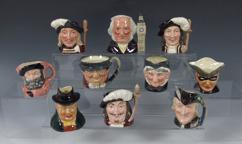 8 ROYAL DOULTON MEDIUM CHARACTER JUGS: ''Aramis'' D6454, small scrap to rim; ''John Doulton'' D6656, for the Collector's Club, 4 3/8''; ''Athos'' RdNo 7245, slight pock mark finish; ''Falstaff'' D6385; ''Tony Weller'', marked ''Souvenir from Darley & Son Sheffield & Rotherham'', tiny flea bites to rim; ''Granny''; ''Porthos'' D6453; and ''Robin Hood'' D6534 with stamp for Shropshire Shop Shrewsbury Mass. Plus two jugs marked with green stamp ''Genuine Staffordshire Hand Painted Shorter & Son LTD England''. One impressed under glaze ''Churchill'' 4''h., the other with raised letters ''Highwayman'' 3 3/4''. Sold as a lot.