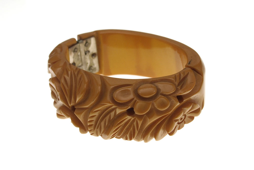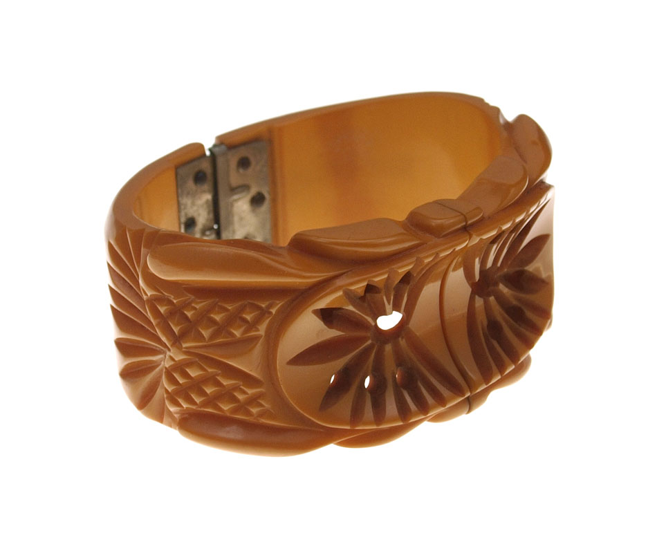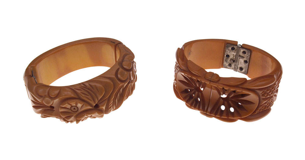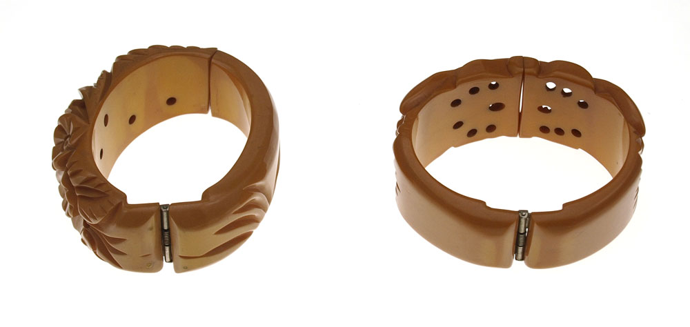 VINTAGE BUTTERSCOTCH BAKELITE HINGED BANGLE BRACELETS: 1) Carved and pierced bangle with good floral detail. 2) Carved and pierced with concave center.