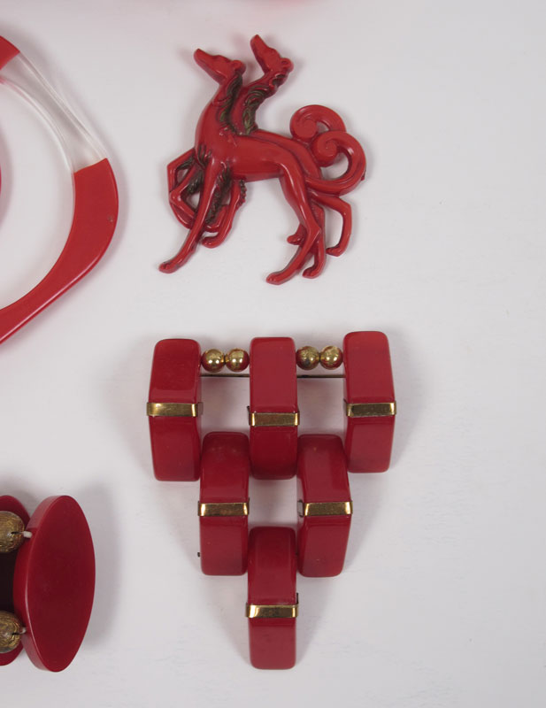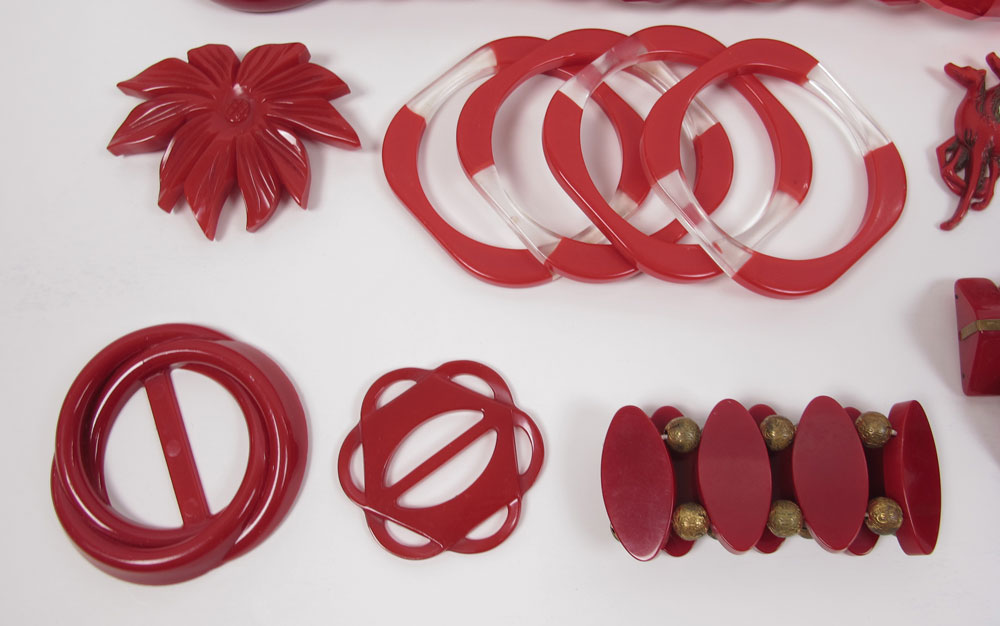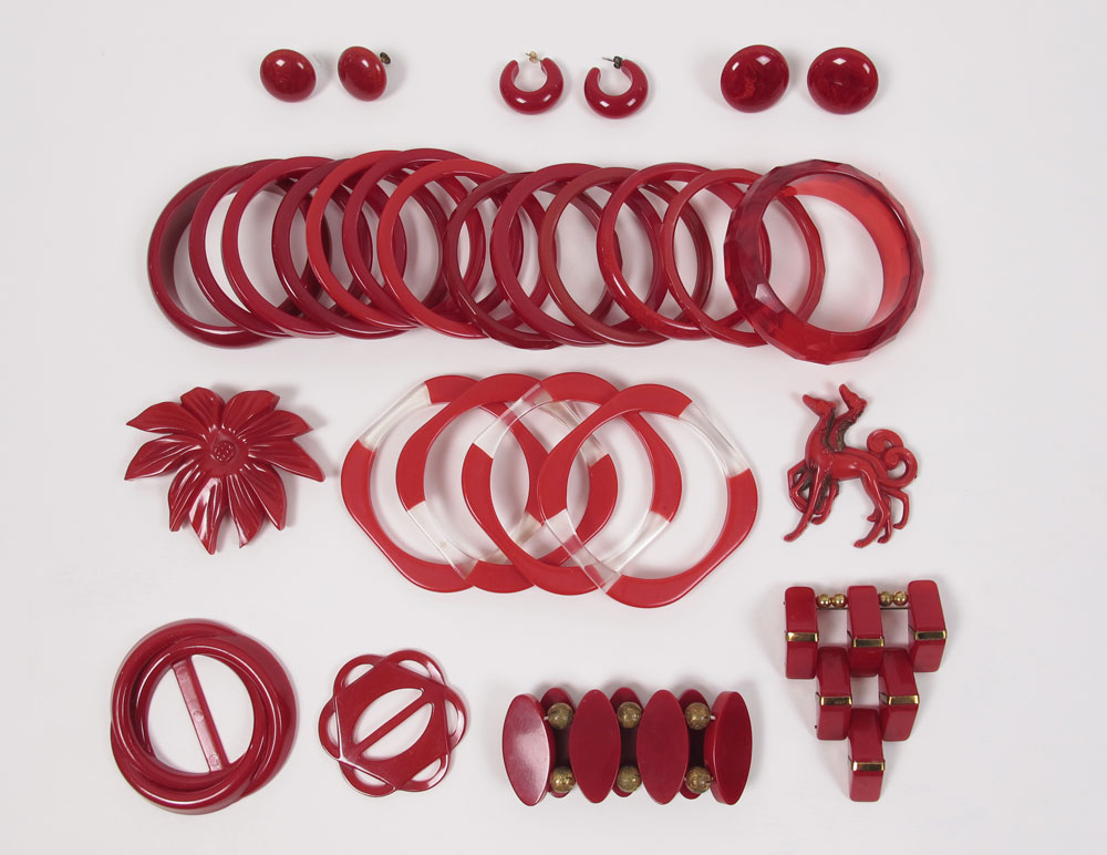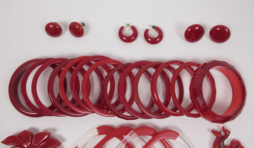 ESTATE TRAY LOT VINTAGE RED BAKELITE AND OTHER PLASTIC JEWELRY: Approx. 30 pieces to include 17 bangle bracelets, Bakelite poinsettia pin, plastic pony pin, a 3 1/2'' tiered Bakelite and brass brooch, Bakelite stretch bracelet, 4 pairs earrings, and 2 buckles.
