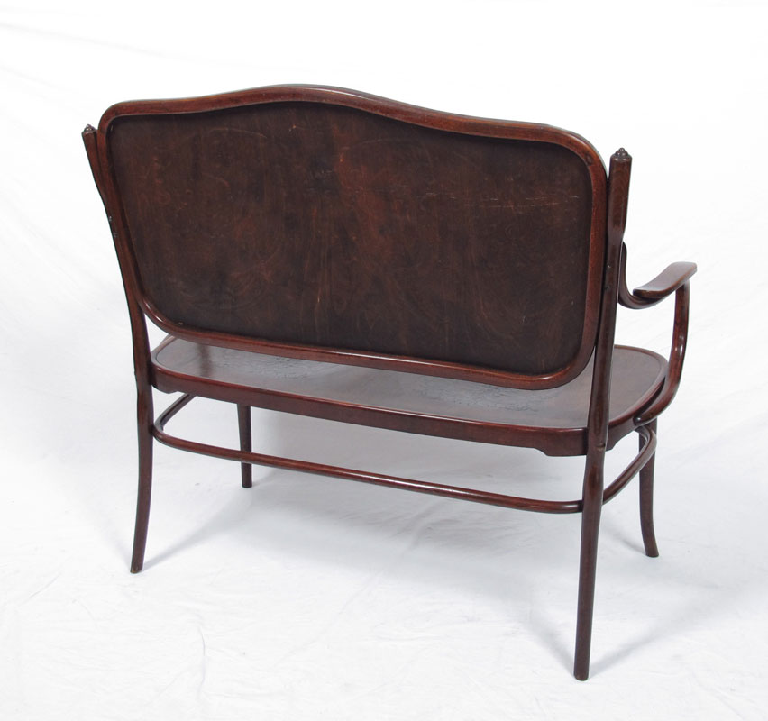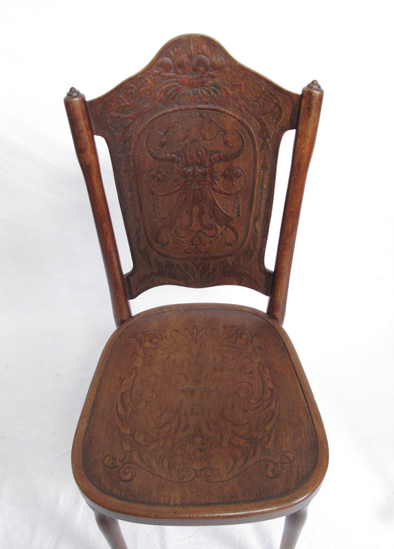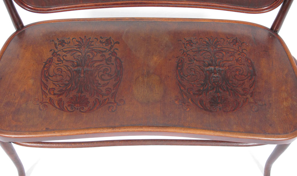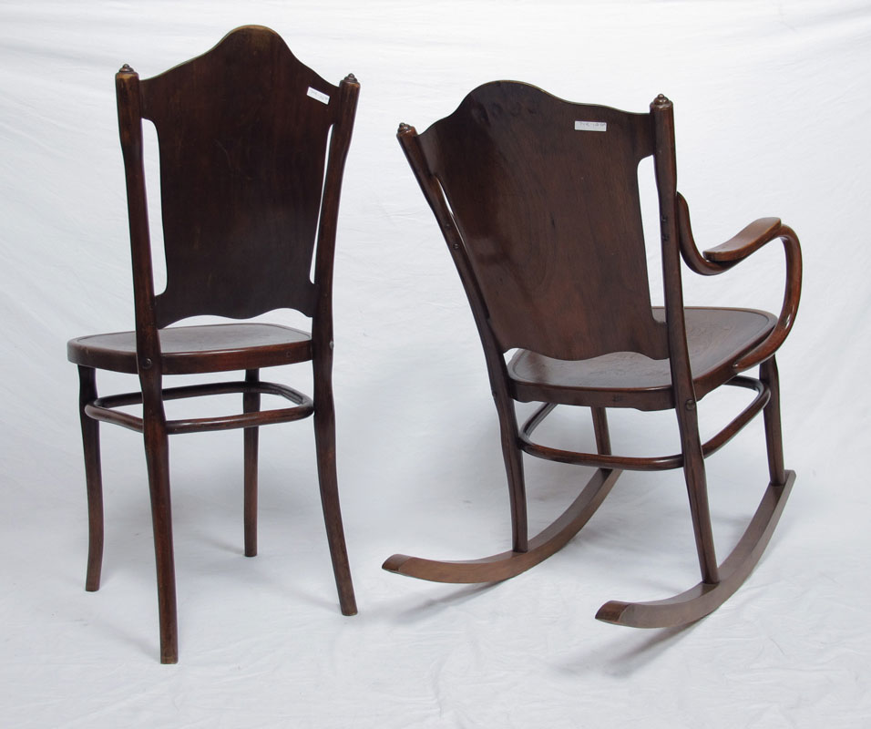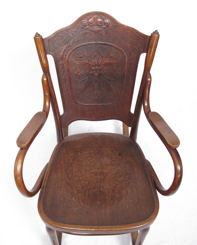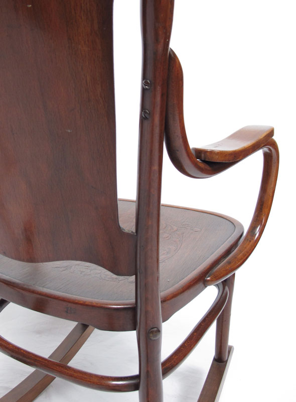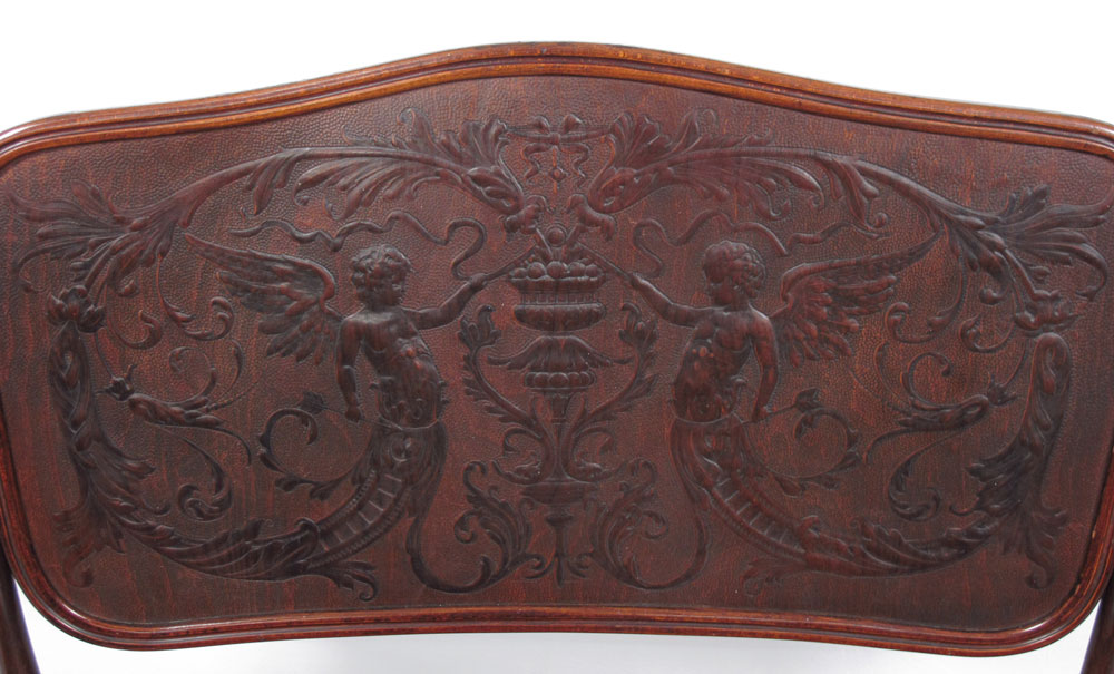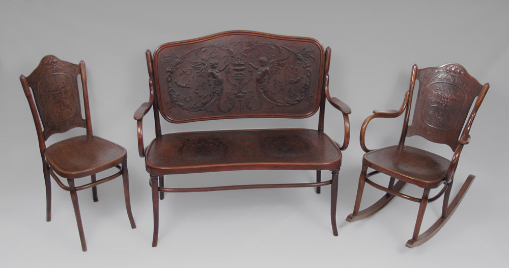 ART NOUVEAU JACOB & JOSEPH KOHN BENTWOOD PARLOR SUITE: Open arm settee, 41'' h. x 46'' x 23''. Rocker 34'' h. x 34'' x 23''. Straight chair 37'' h. x 16'' x 20''. All with Northwind pressed pattern, the settee with an elaborate back with angels.