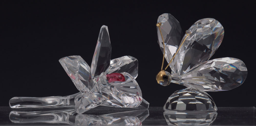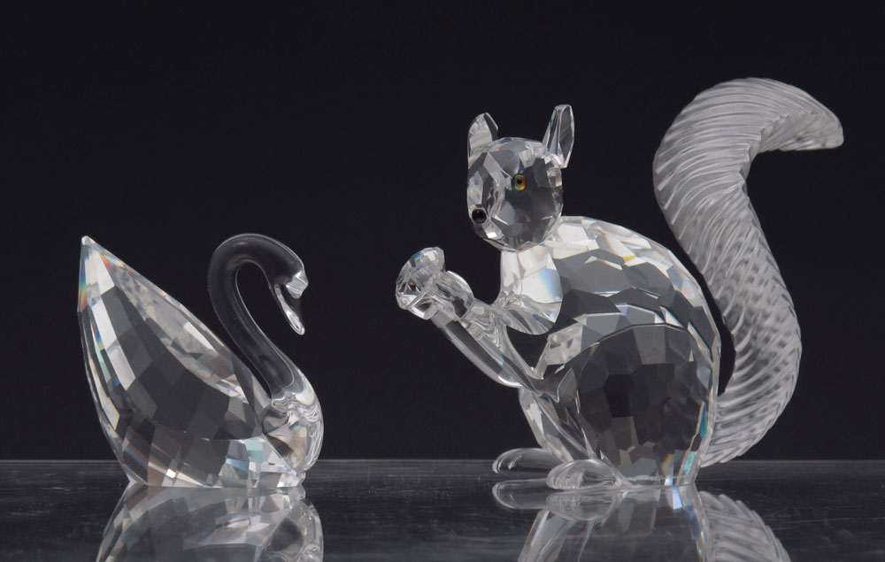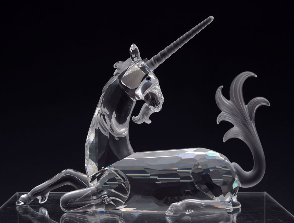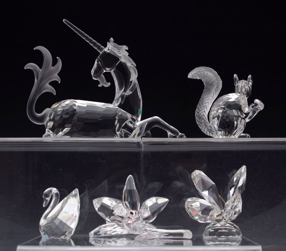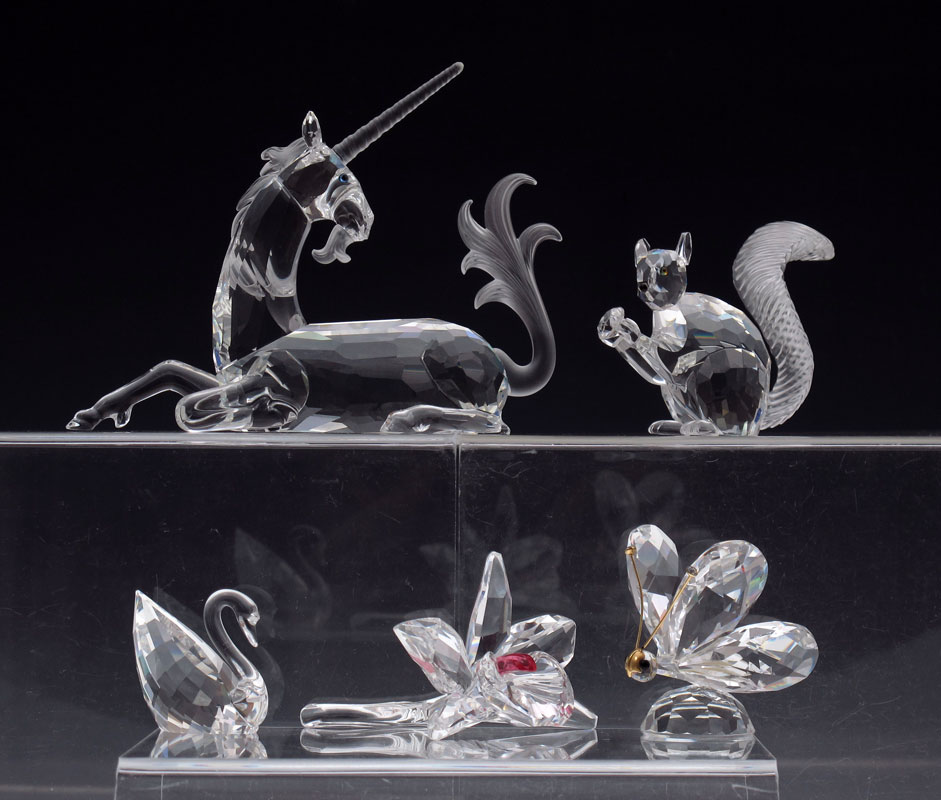 5 SWAROVSKI CRYSTAL FIGURINES: Butterfly, large, team design, 1982, retired 2006, signs of being reattached to base; Swan, designed by A. Hirzinger, 1995; The Unicorn from Fabulous Creatures, designed by M. Zendron, SCS Annual Edition 1996, signs of reattached tail and horn; The Orchid, Pink, designed by M. Stamey, 1996, retired 2007; The Squirrel, 19th Anniversary Edition SCS Jubilee, designed by A. Hirzinger, 1997.