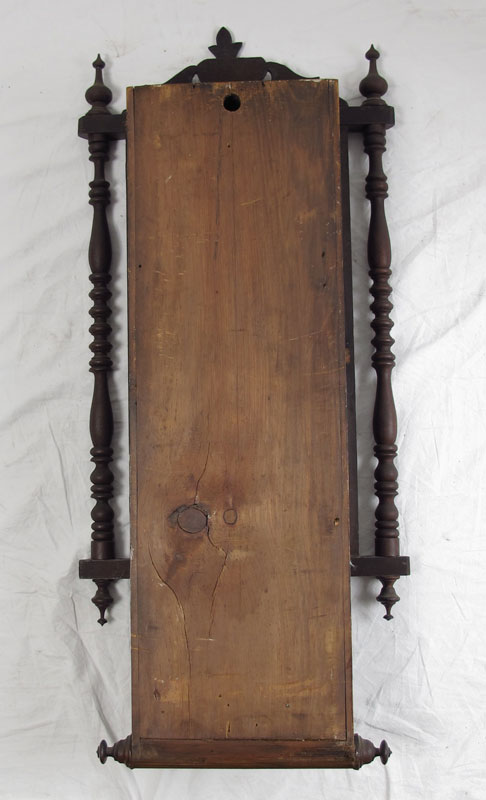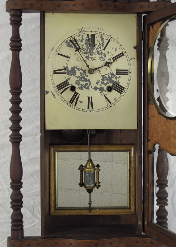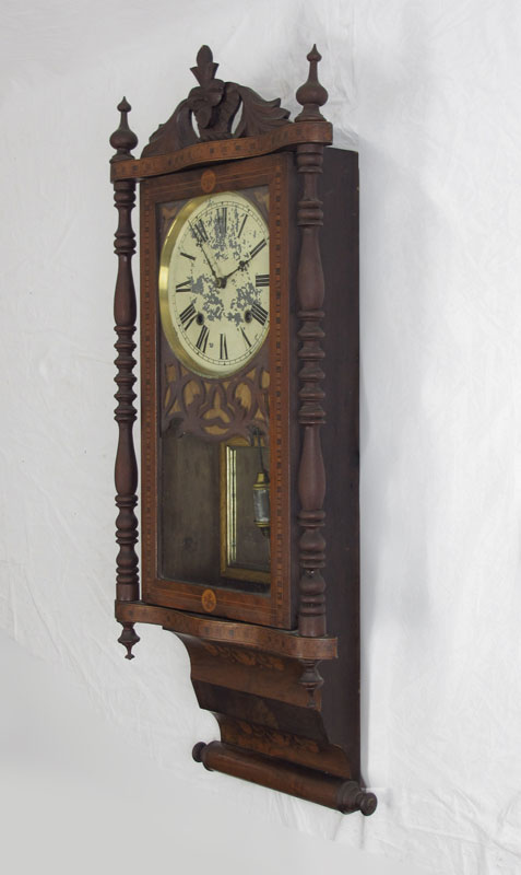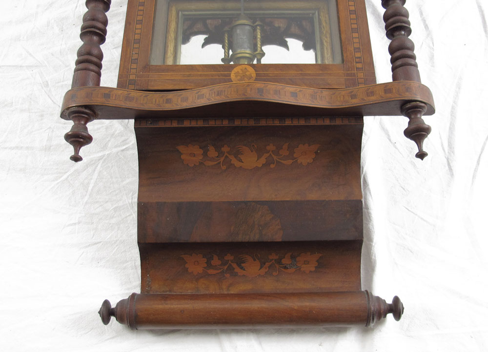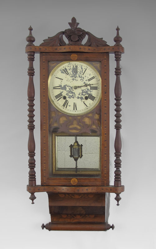 GERMAN INLAID WALL CLOCK: Parquetry and floral marquetry inlay case with turned full columns and carved crest. Square painted metal face with time and strike movement. No key. 34'' x 15 1/2'' x 6''.