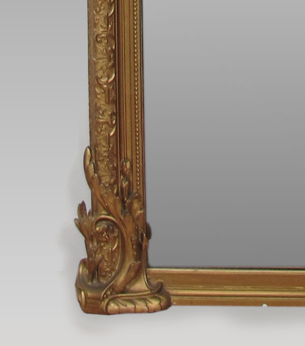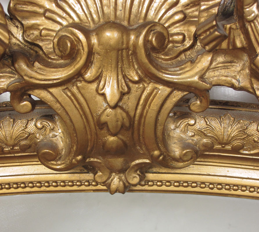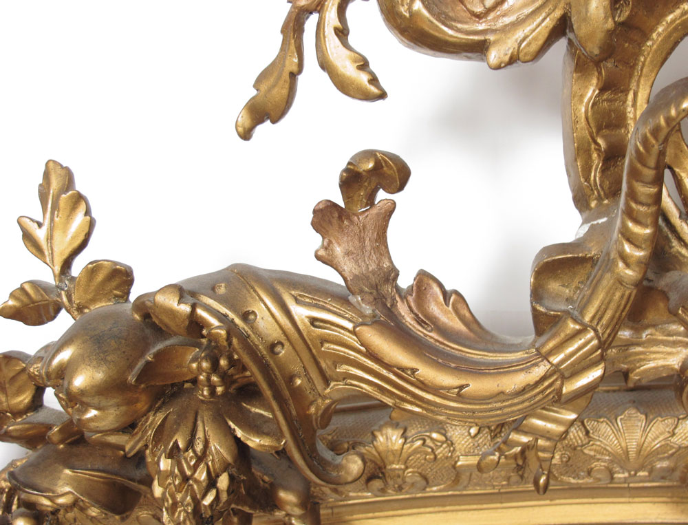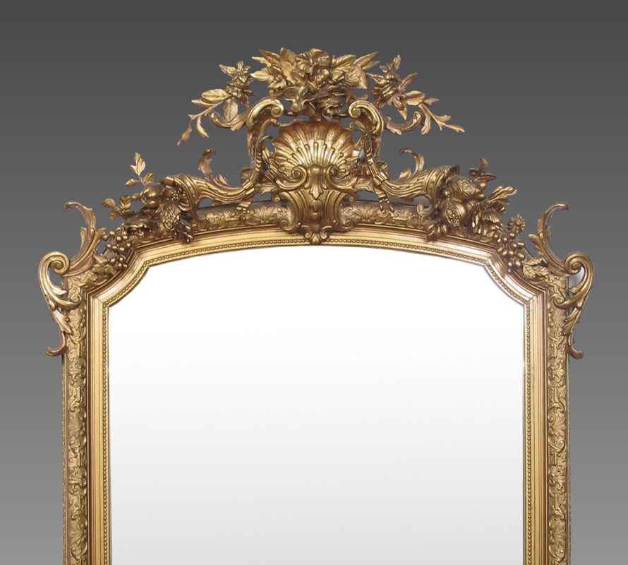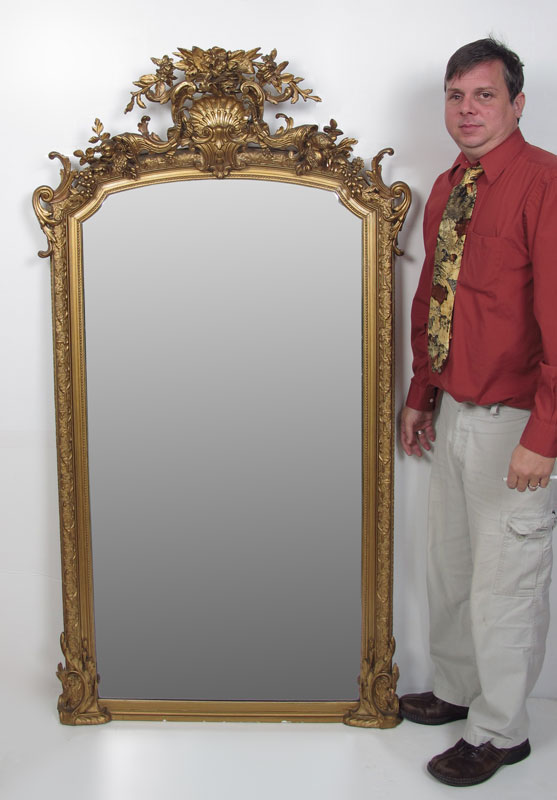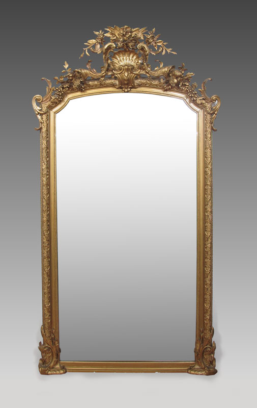 A CARVED AND GILT OVER MANTLE OR PIER MIRROR: Elaborate detail of shells, and cornucopia of fruits and florals. String of pearl molded frame. Overall gilt finish. Approx. 70'' tall x 38'' wide x 7'' deep.