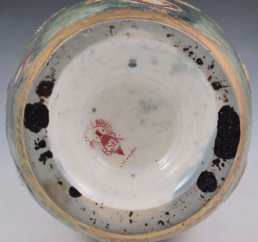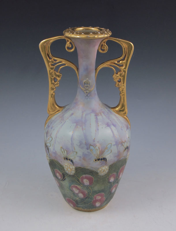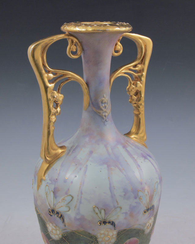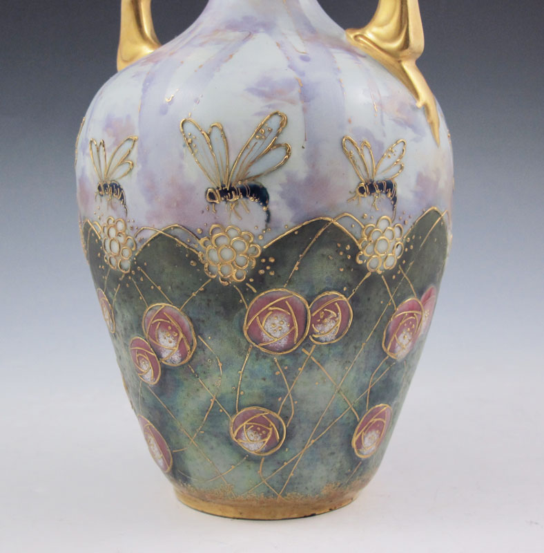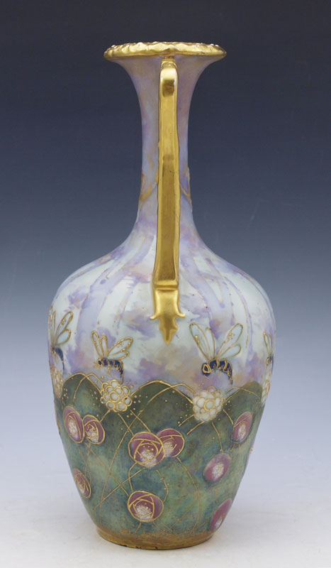 RIESSNER, STELLMACHER & KESSEL TURN TEPLITZ PORCELAIN VASE: Austria, 1892-1905. Mottled and iridised ground with enamel and gilt decoration in a wasp and flower motif. 10 1/2'' tall.
