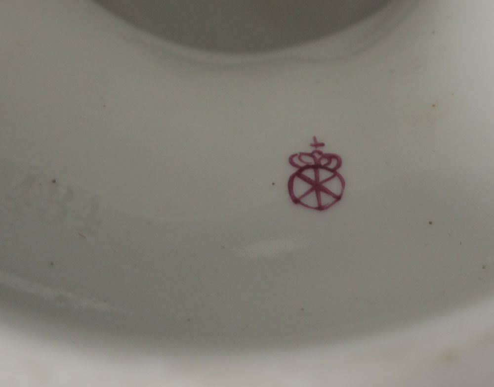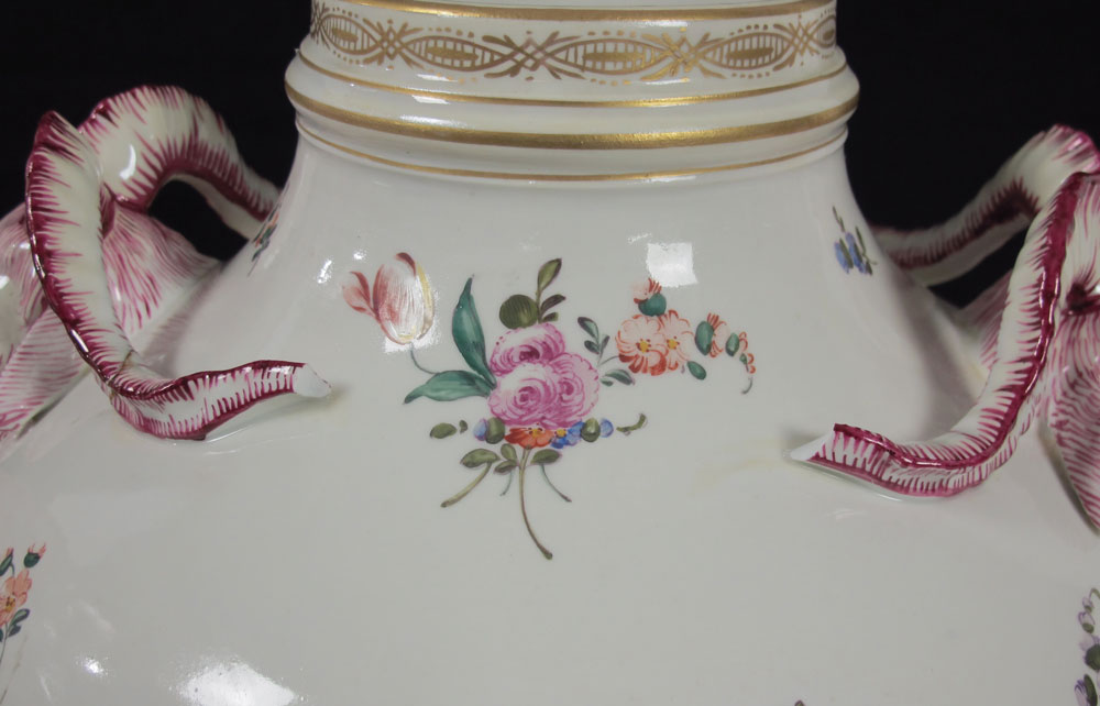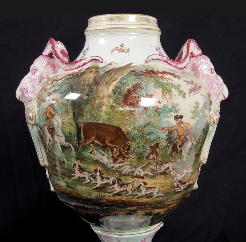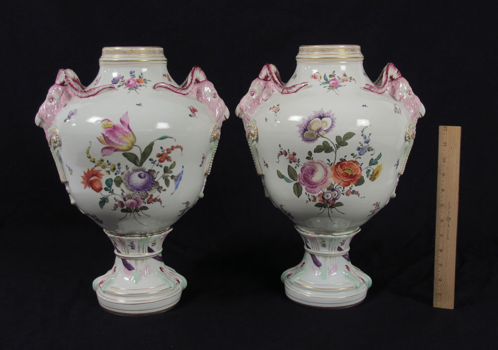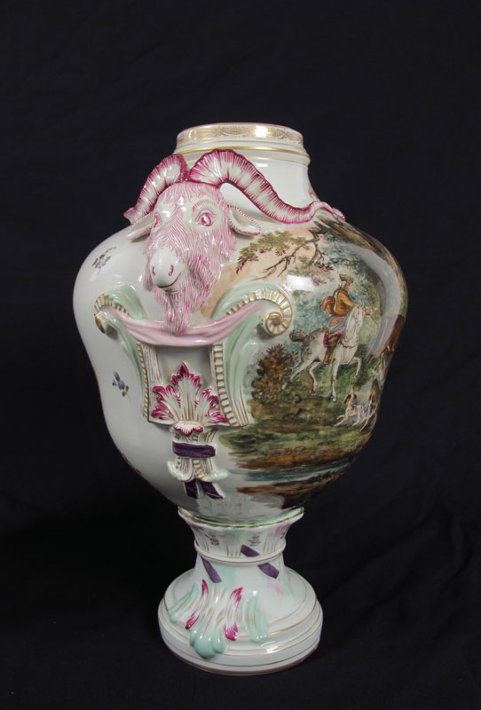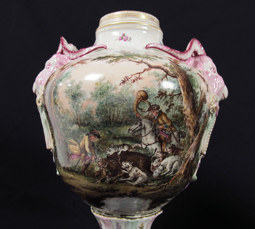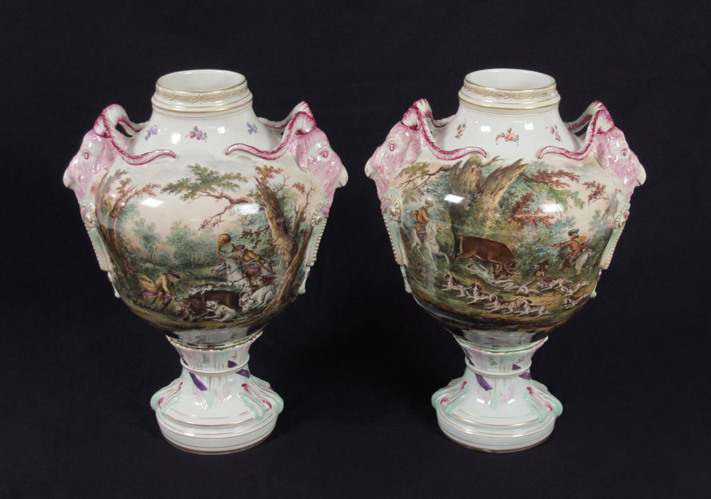 PAIR HAND PAINTED FINE GERMAN PORCELAIN URNS: Hand painted hunt scene with flowers verso. Approx. 17'' tall.