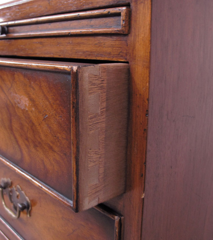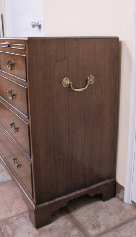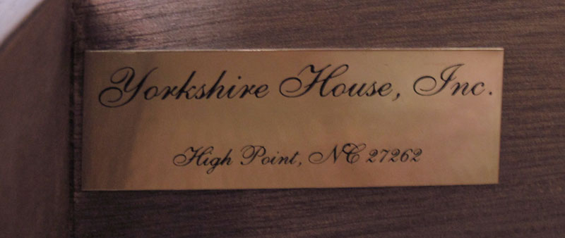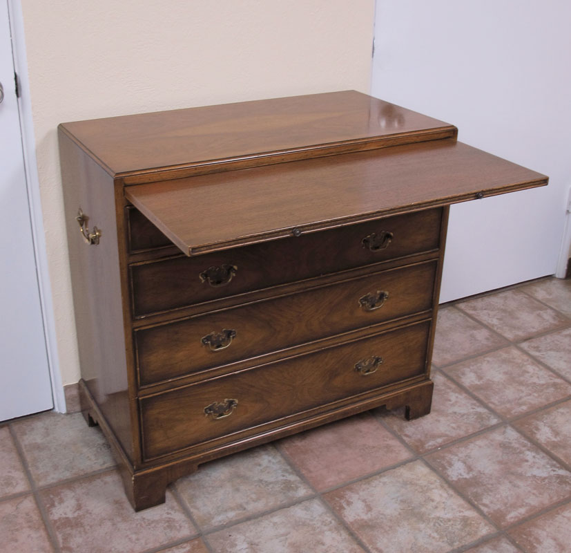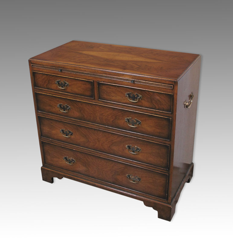YORKSHIRE HOUSE ''MODERN HISTORY'' CHEST: Two over three drawer chest with slide out butler's tray and brass side handles. Molding frames each of the drawers. Approx. 32'' tall x 17 1/2'' x 33 1/2''.