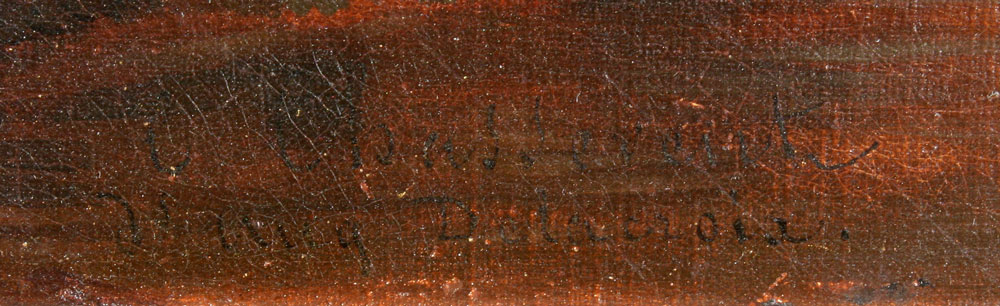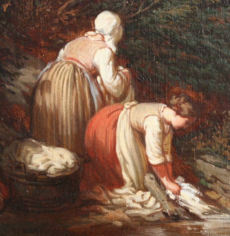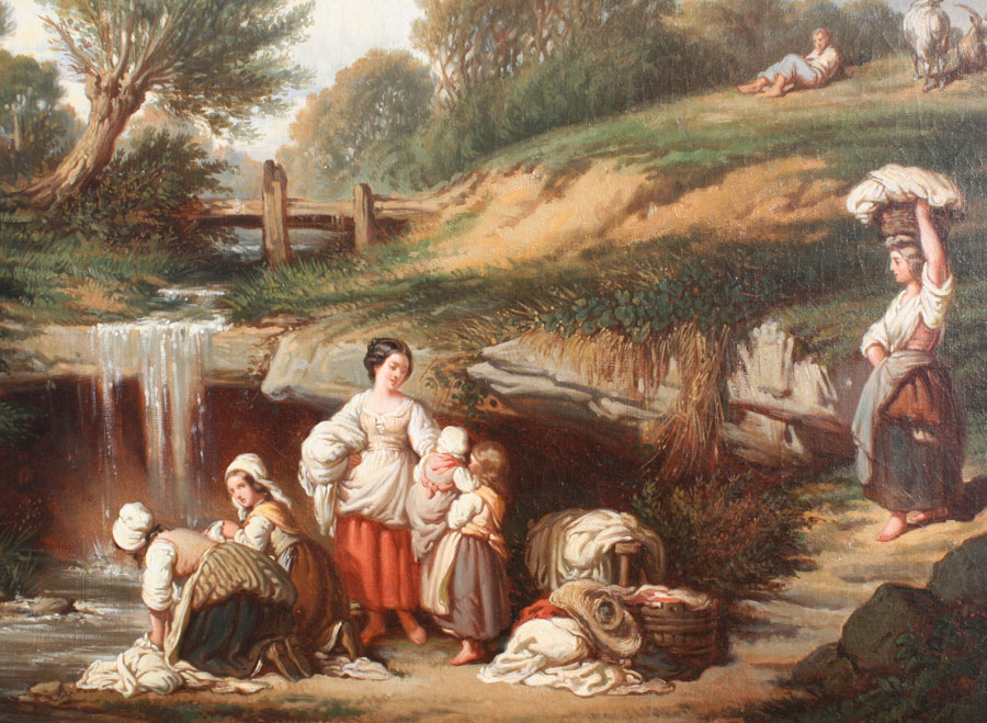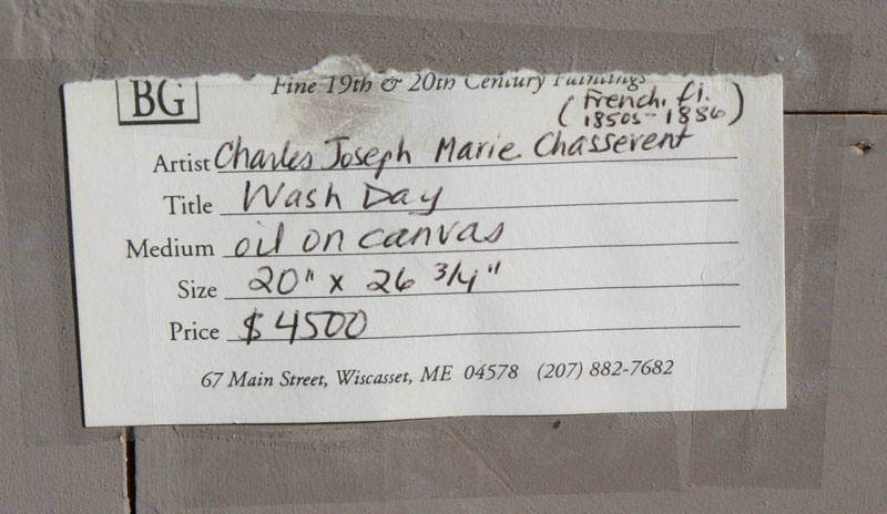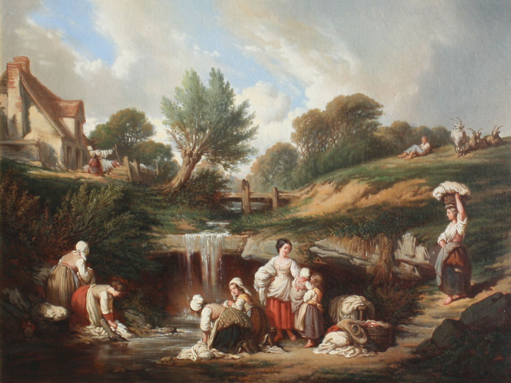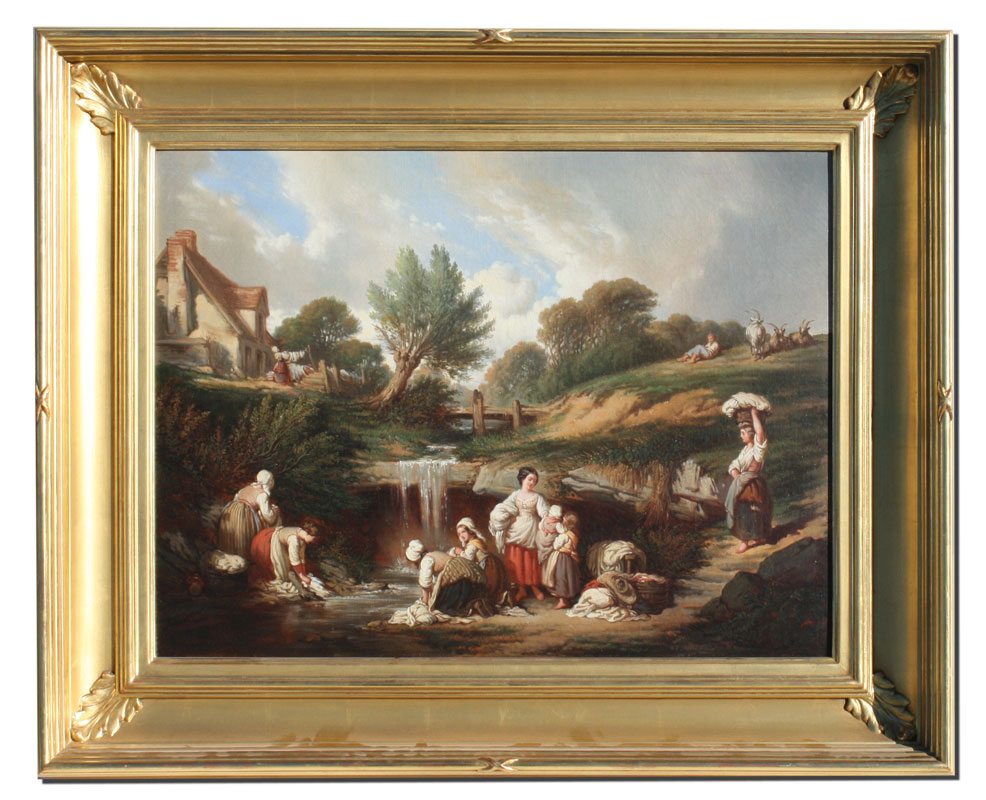 CHASSEVANT, Marie Joseph Charles, (French, 19th C.): Landscape with Washer Women after Delacroix, OIL/Canvas, 20'' x 27'', signed lower right, contemporary gilded gesso frame, 25 1/2'' x 35 1/2''.
