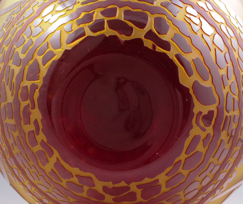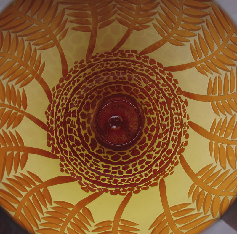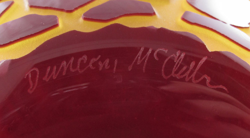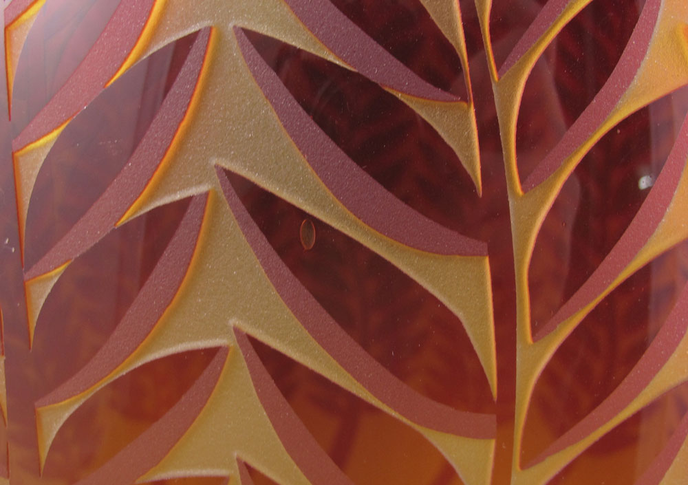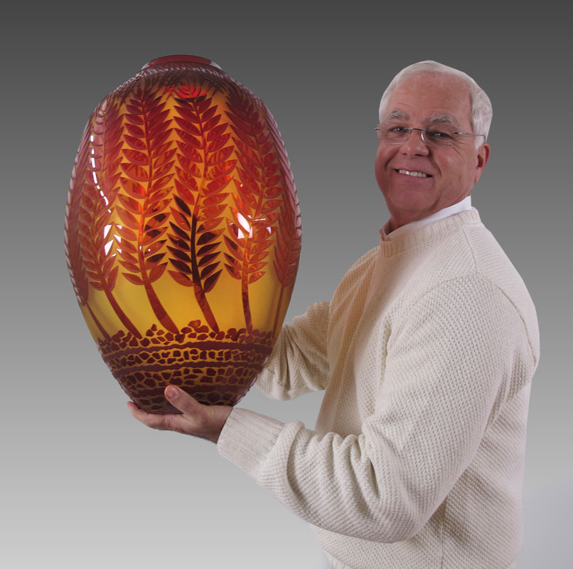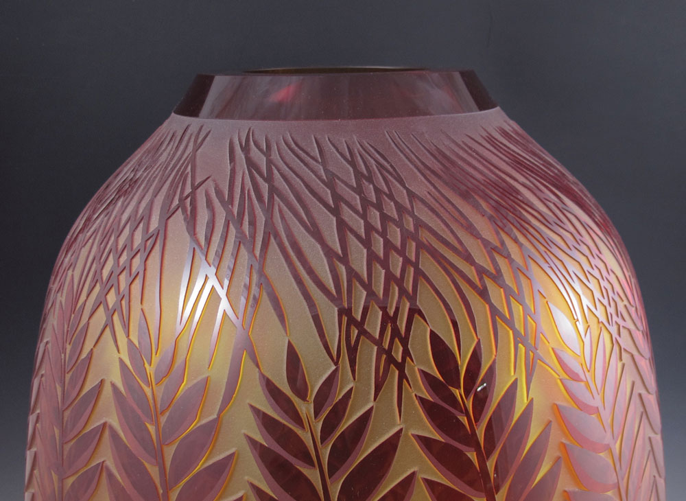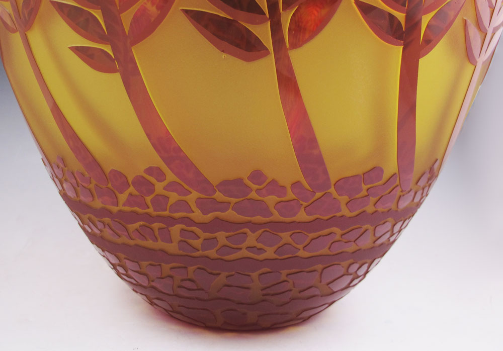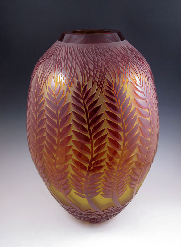 McCLELLAN, Duncan, (American 1955-): Monumental art glass vase, Etched and sculpted with fern stems, leaves and rocks. Red to amber glass. Signed on base. 22 1/2'' h. x 13 1/2''.