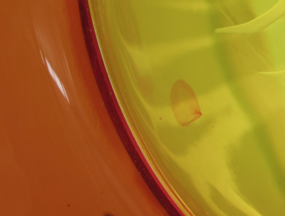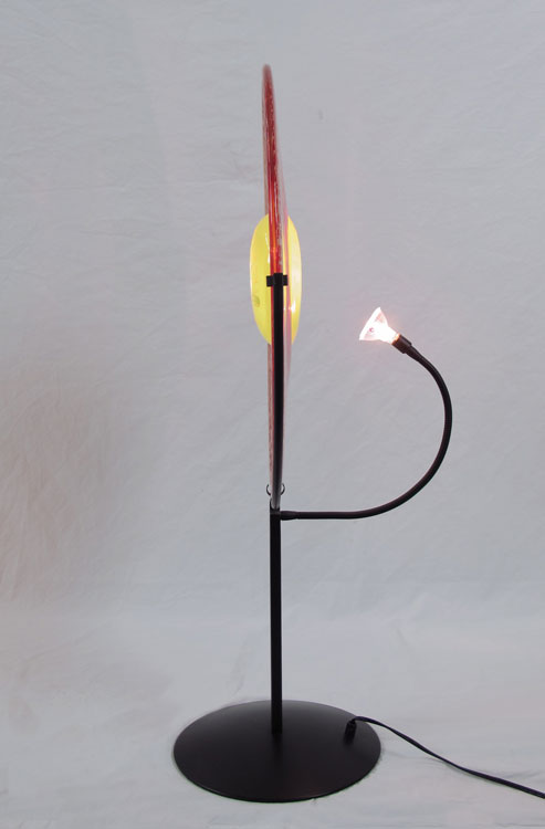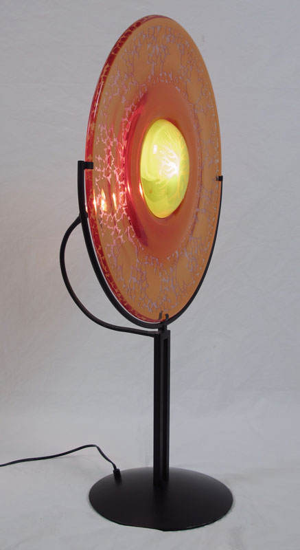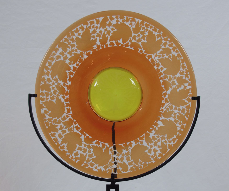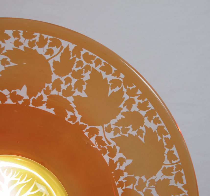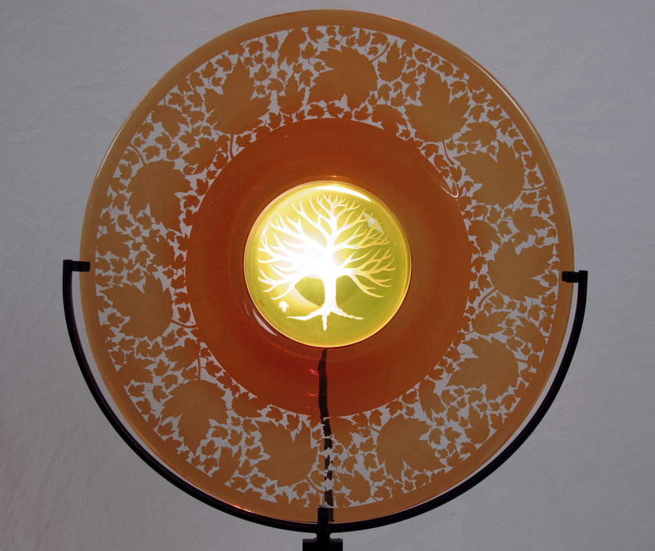 McCLELLAN, Duncan, (American 1955-): Etched and sculpted rondelette with maple leaf rim and maple tree interior. Lamp verso creates the effect of continuous sun light. Metal stand. 35 3/4'' h. x 22'' x 11''.