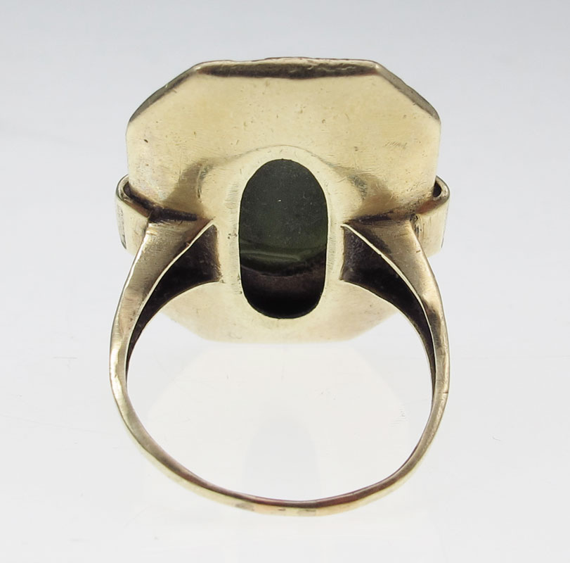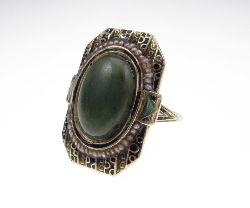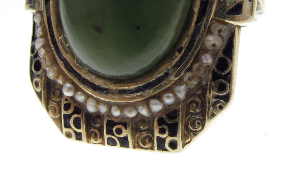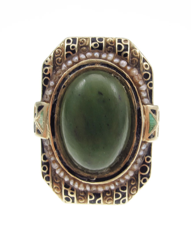 14K NEPHRITE JADE RING: 14K yellow gold ring contains one 16.00 x 12.00 mm oval cabochon cut piece of nephrite jadeite and Seed pearls. Black and green enamel design. The jade is bezel and epoxy set. The pearls are epoxy set. Weight: 11.4 grams. Size: 8