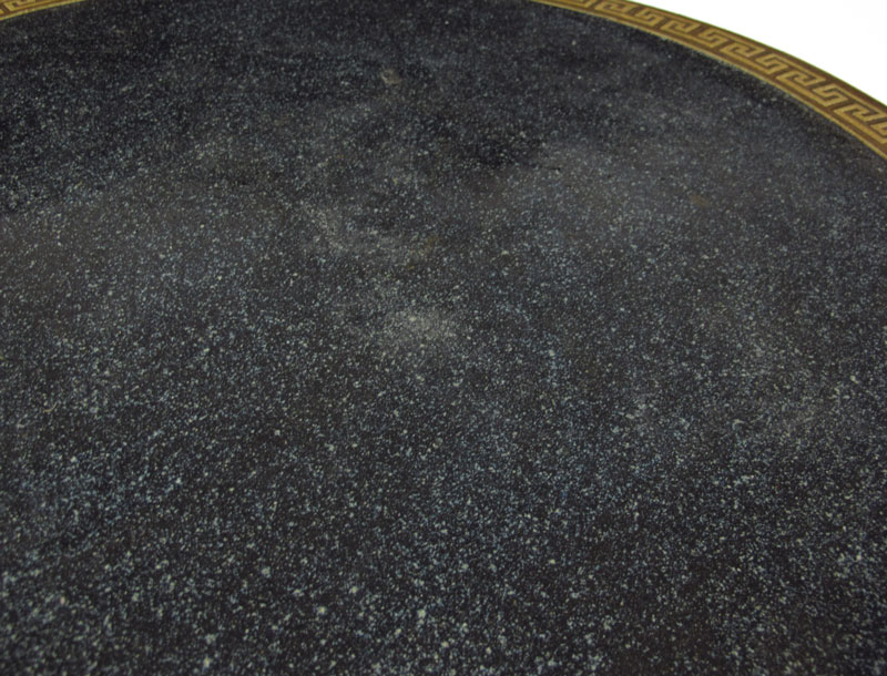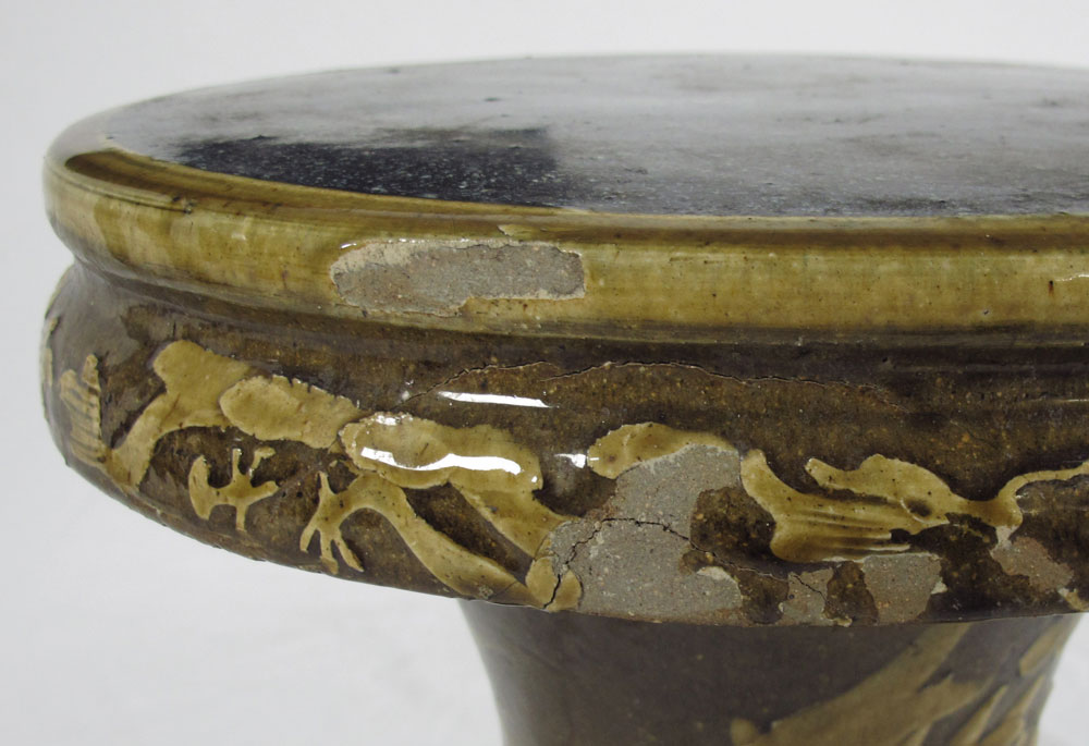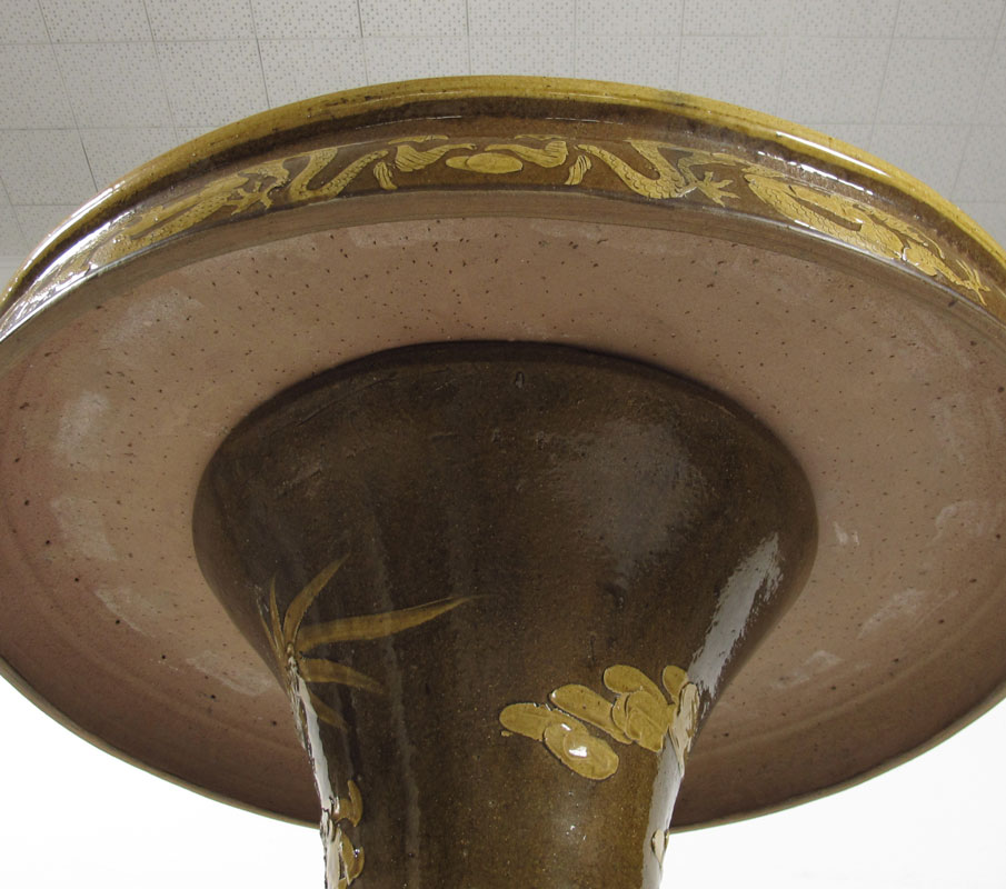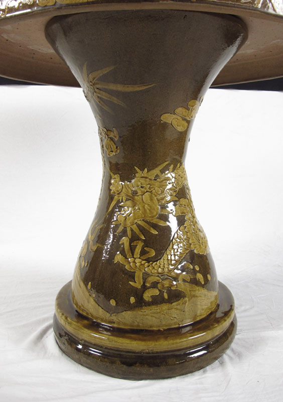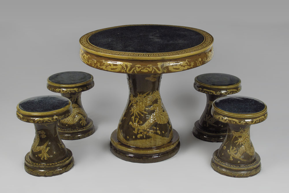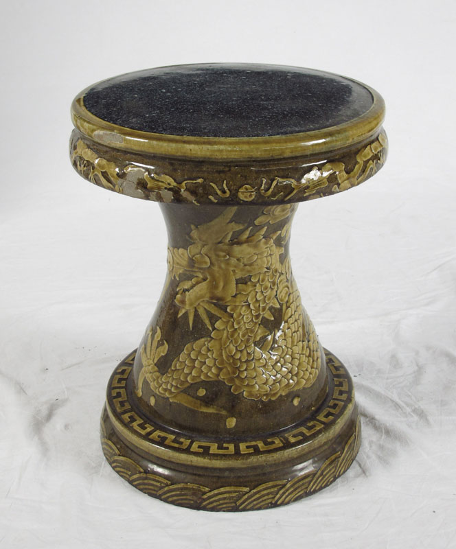 CHINESE CERAMIC DRAGON DECORATED TABLE WITH STOOLS: Asian design with dragons and key. Table 30'' x 33'' round. Seats 16 1/2'' x 13''.