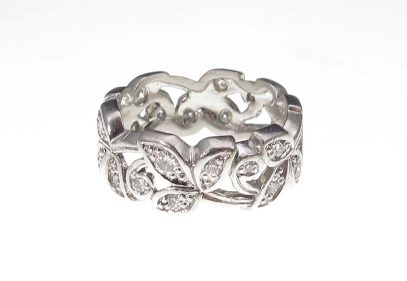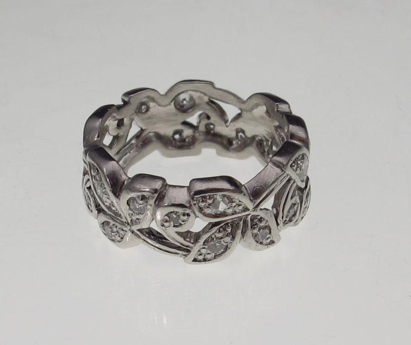 ART DECO PERIOD PLATINUM DIAMOND BAND: Platinum band contains twenty four round brilliant cut diamonds. Weight: .50 Ct. Approx. The diamond average VS in clarity and G-H in color. The diamonds are bead set. Floral design. Weight: 8.0.grams. Size: 5