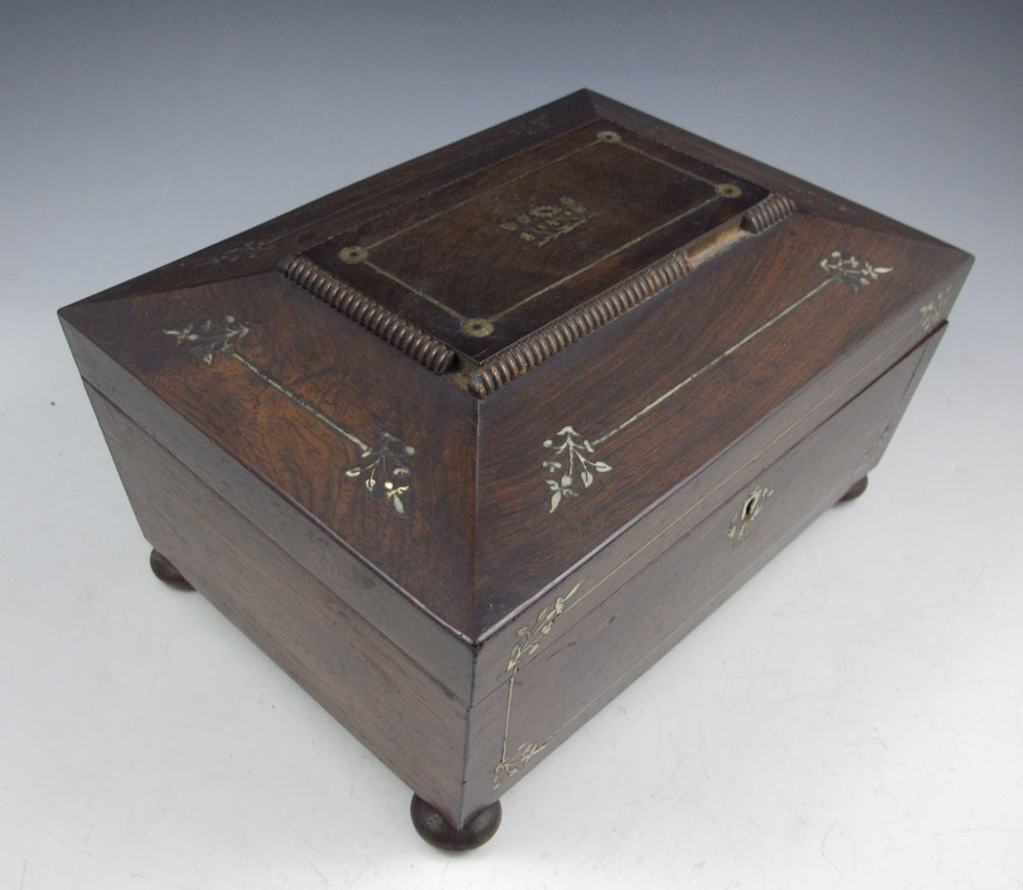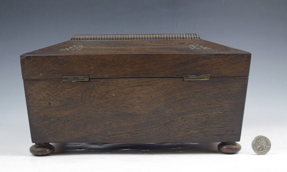 CONDITION: Note minor inlay loss, bubble to veneer, scratches, missing trim, tears to interior fabric and paper. Split to base.