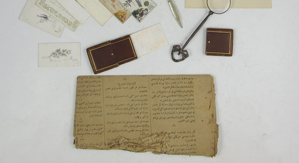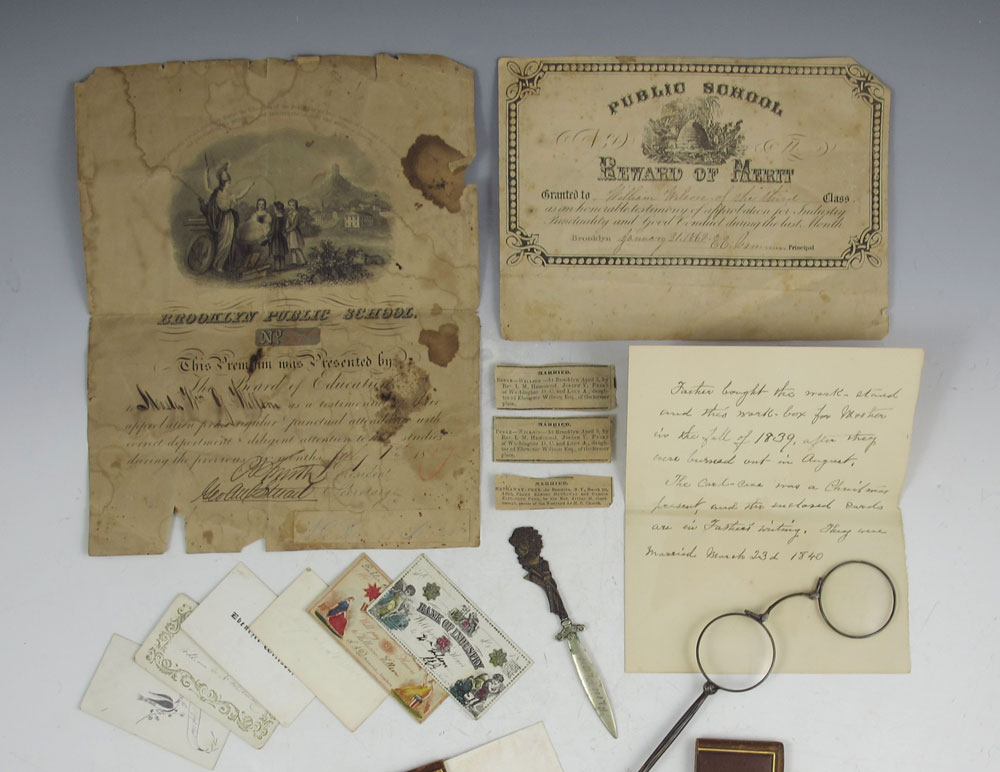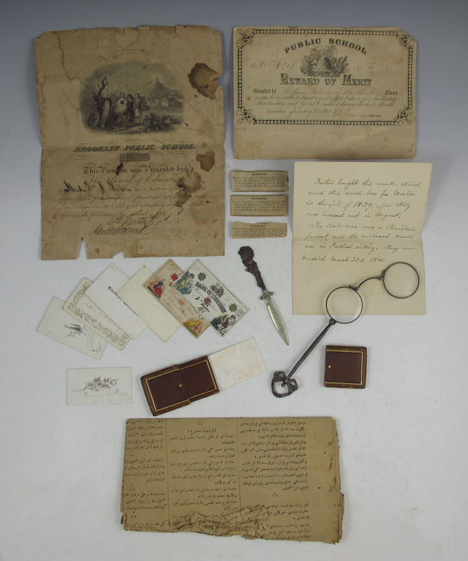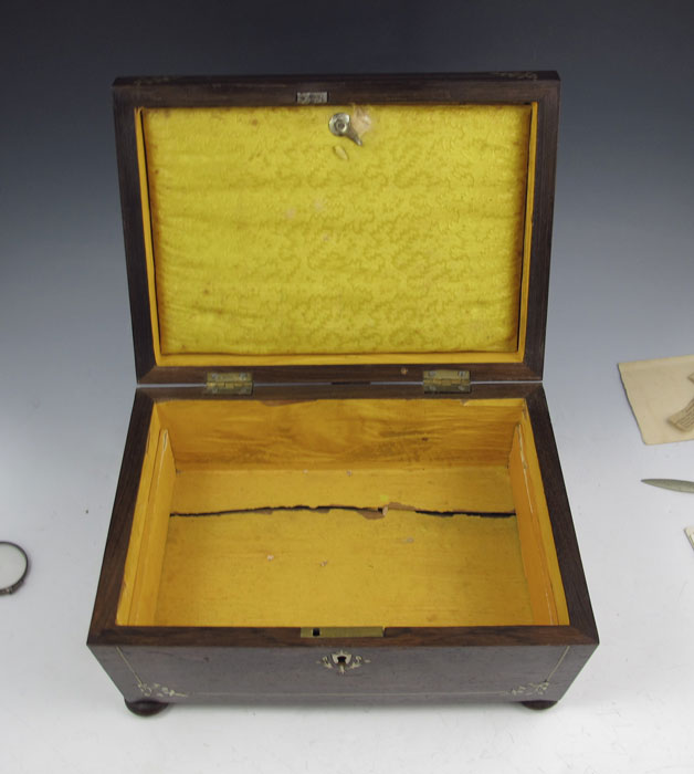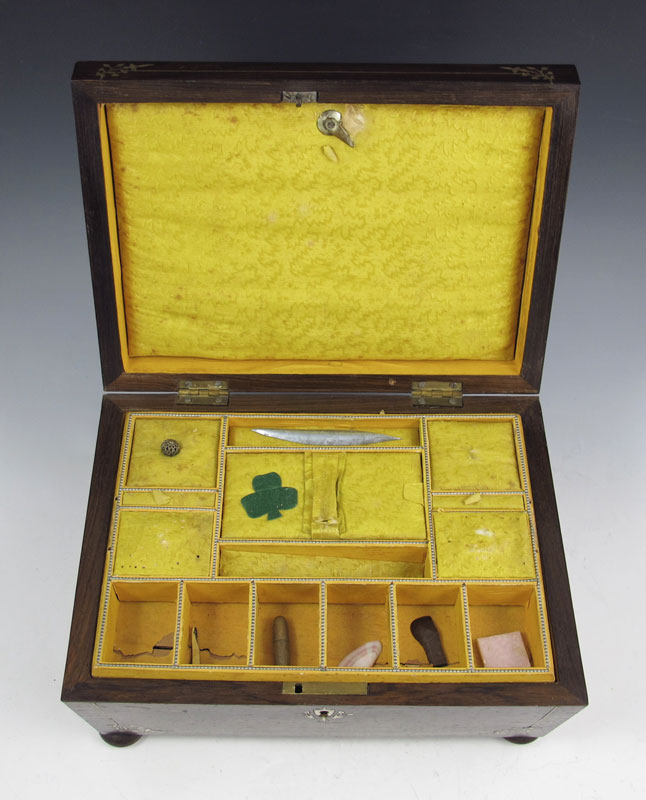 MID 19TH CENTURY INLAID TRAVEL BOX: Mother of pearl inlay, cloth and paper lined interior with compartmented shelf. Box contains family papers and assortment of items dating back to 1862 including a letter describing how the box was purchased in 1840 after the family had been burned out. Also includes 19th English sterling case pocket watch and other trinkets. 6'' x 11'' x 8''.