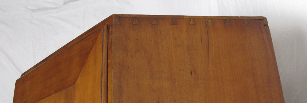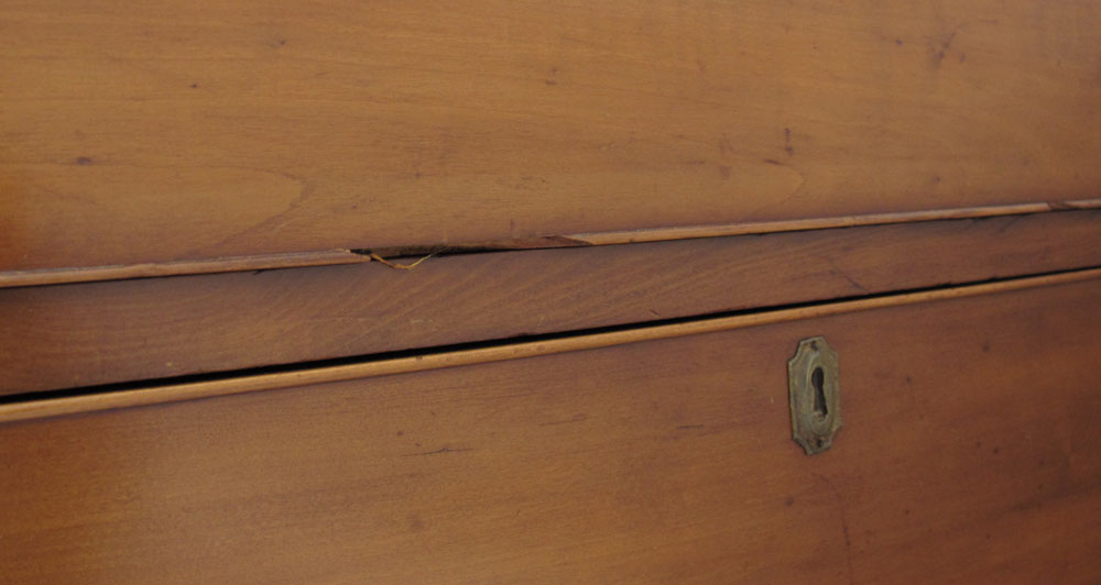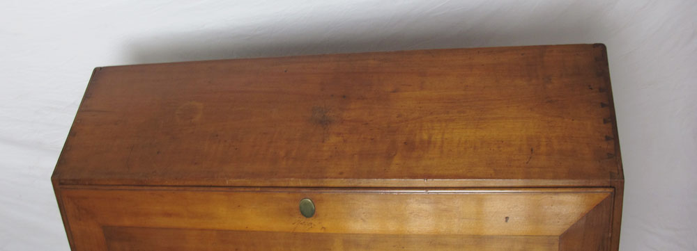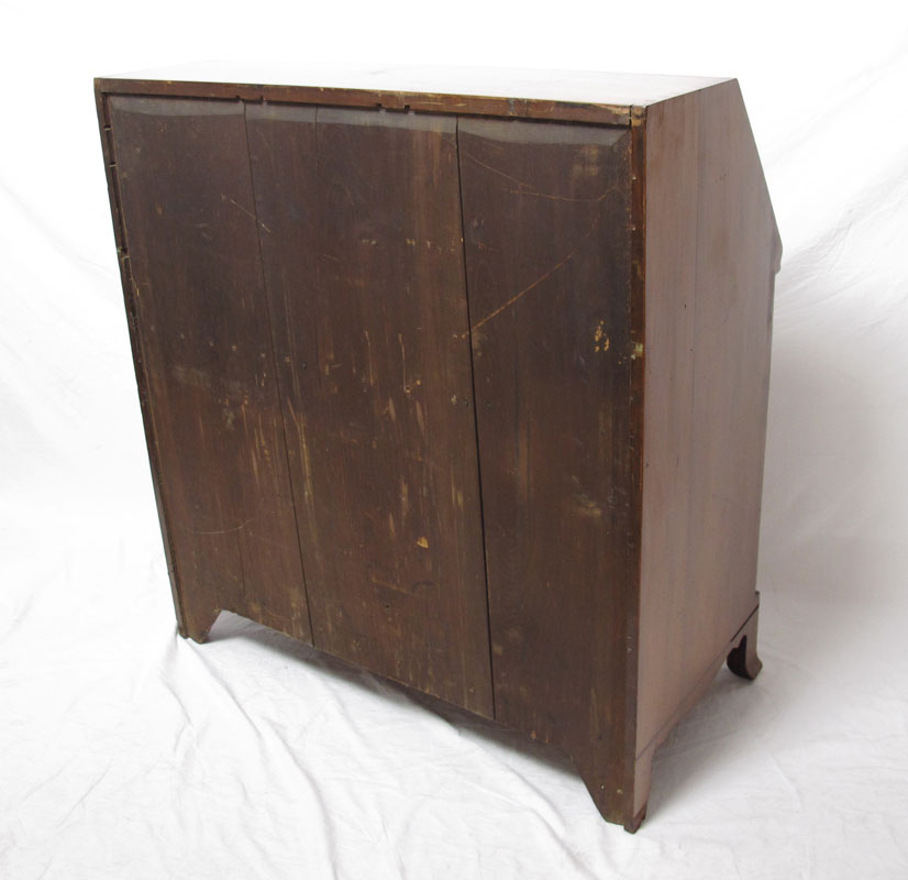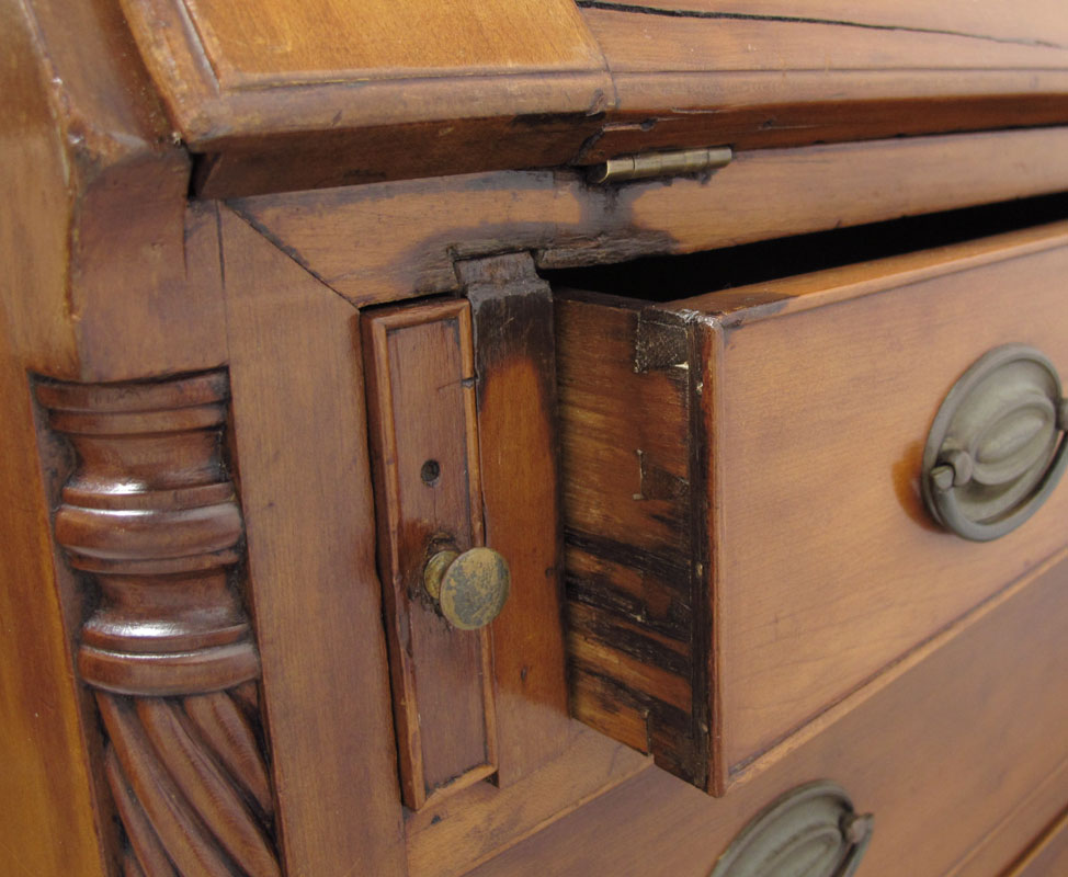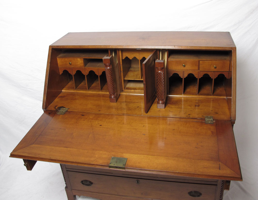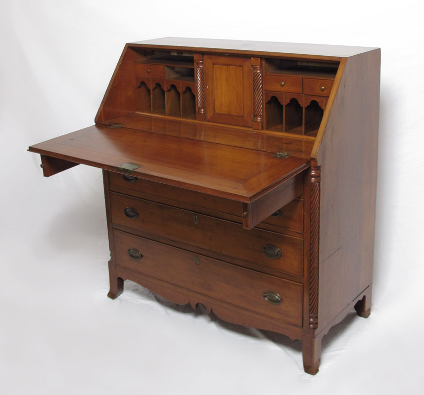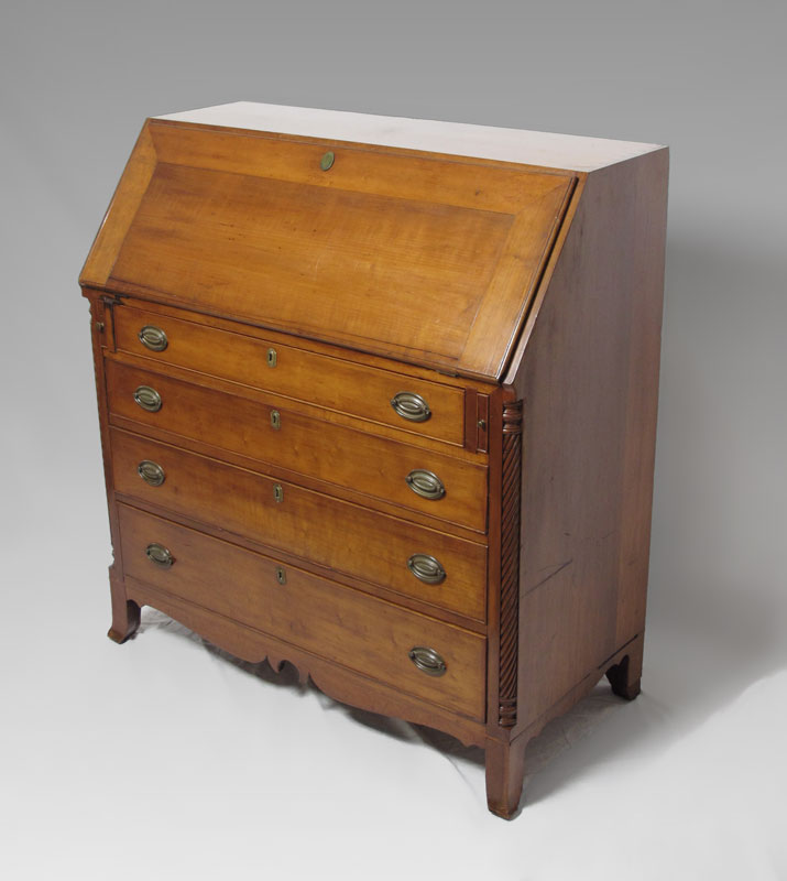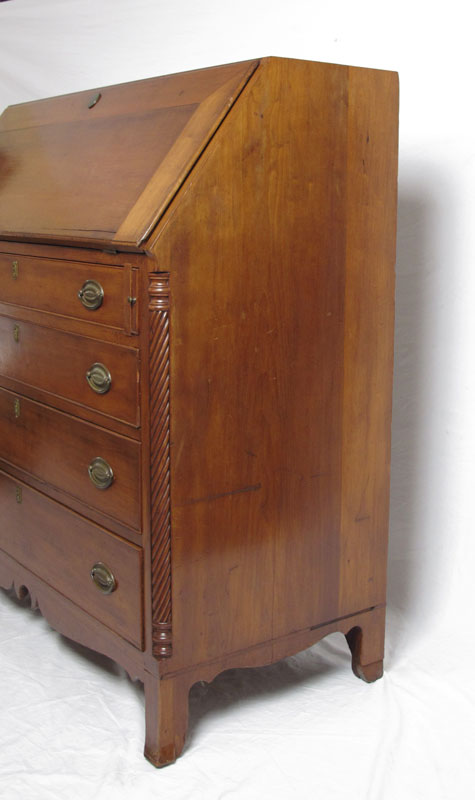 CIRCA 1800 OHIO CHERRY SLANT FRONT DESK: Slant front interior with compartmented interior of pigeon holes, drawers and lockable ''safe''. Lower case of four graduated drawers flanked by spiral turned quarter columns. French feet, shaped apron. Approx. 44 1/2'' tall x 42'' wide x 20'' deep.