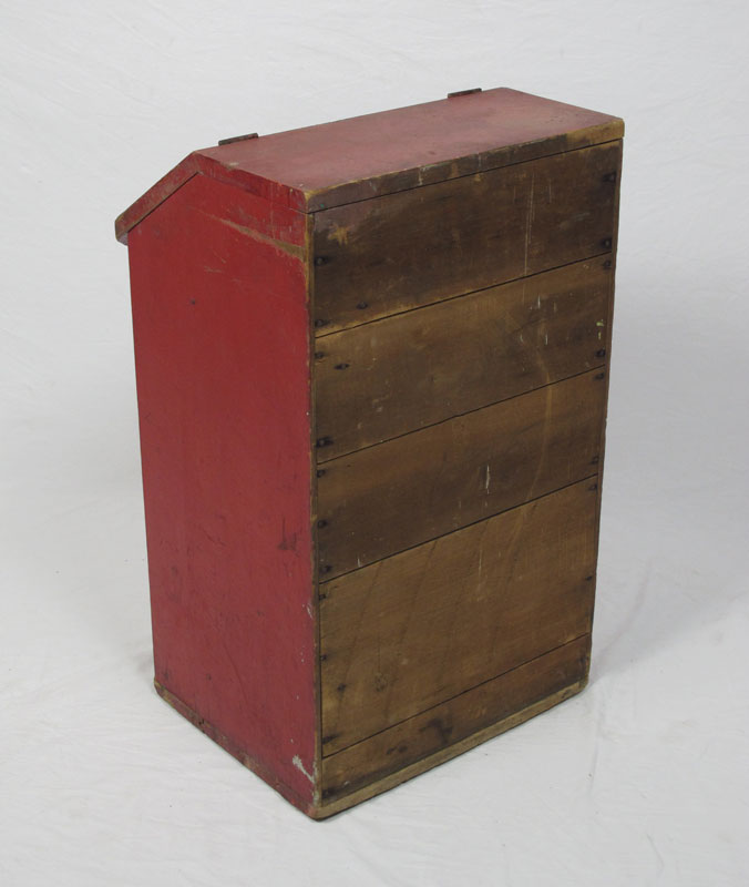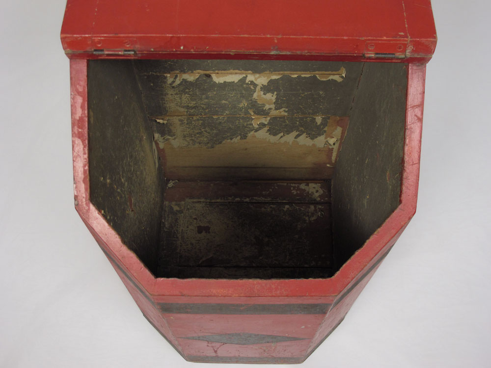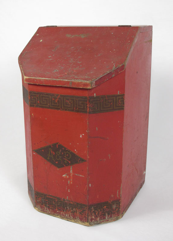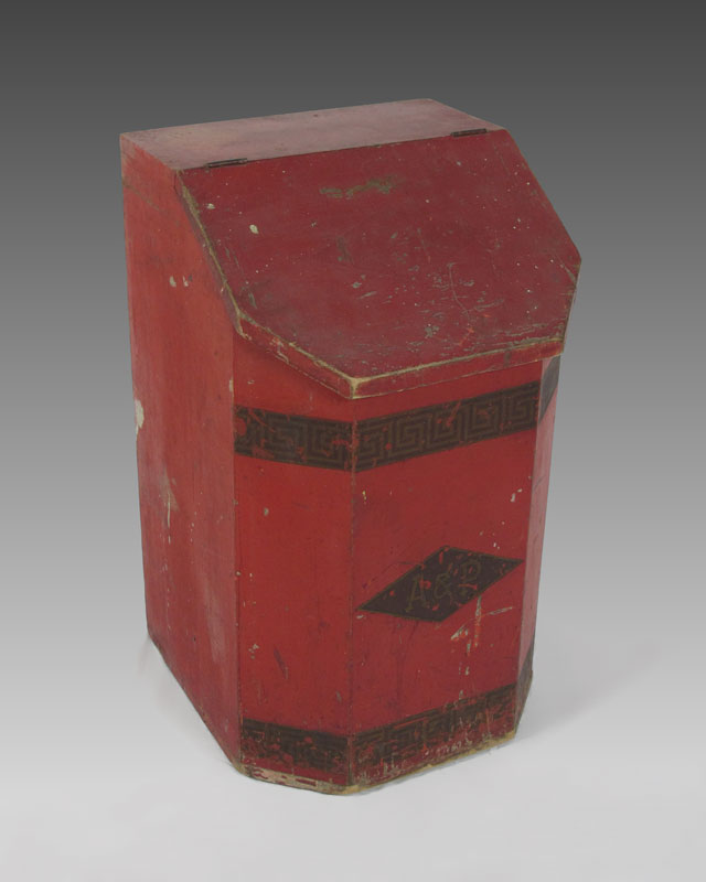 RED PAINTED A & P ADVERTISING COFFEE CRATE: Red painted lift top with Greek key painted band at top and bottom with diamond design and A & P insignia. 30'' h. x 18'' x 18''.