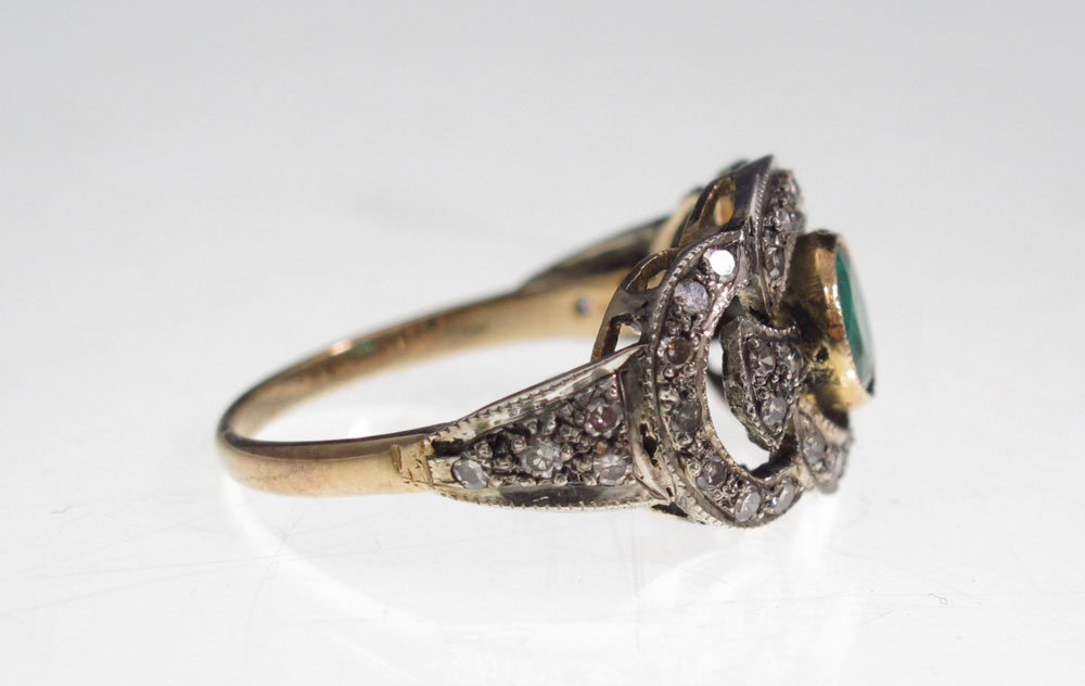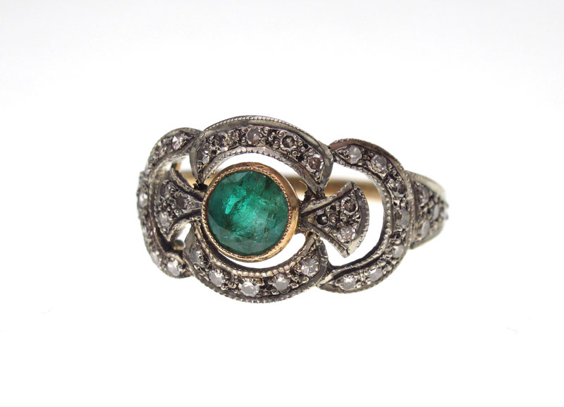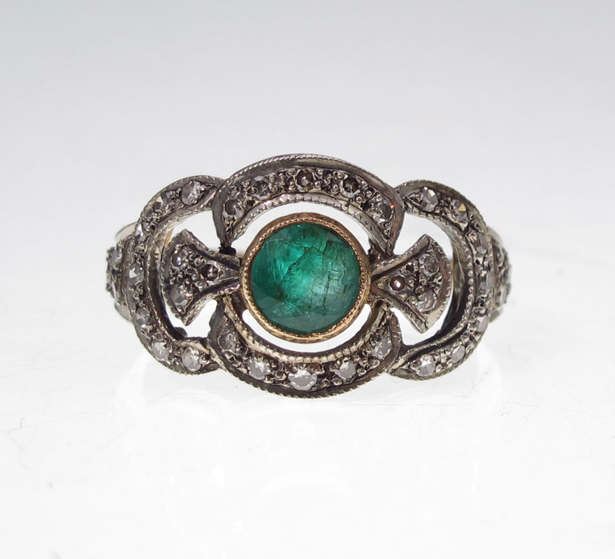 ANTIQUE STYLE EMERALD AND DIAMOND RING: 18K yellow gold and sterling ring contains one round mixed cut emerald. Weight: .40 Ct. Approx. Rated SI in clarity (Type III), G in Hue, 5 in Tone and 3 in Saturation. Thirty eight round single cut diamonds. Weight: .33 Ct. Approx. Rated VS-SI in clarity and Light Brown in color. The emerald is bezel set. The diamonds are bead set. Weight: 3.6 grams. Size:8.5