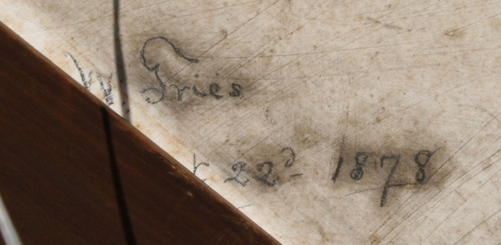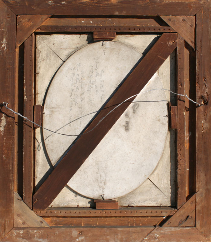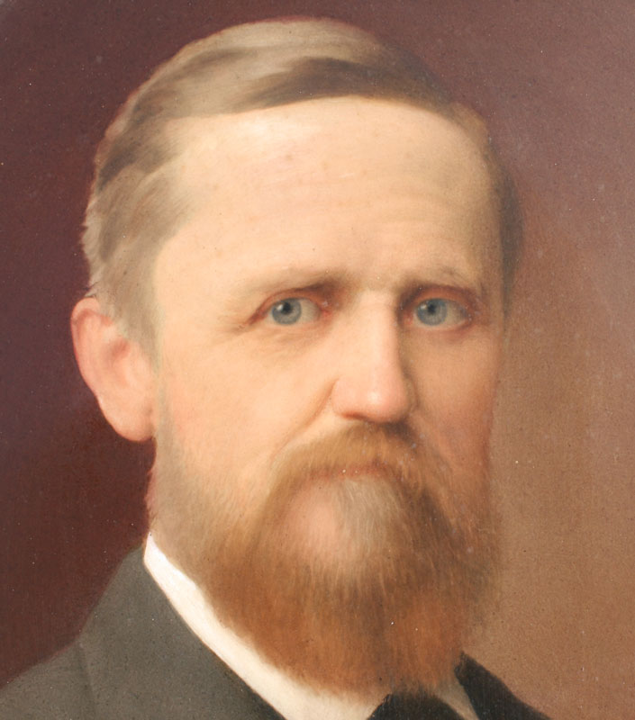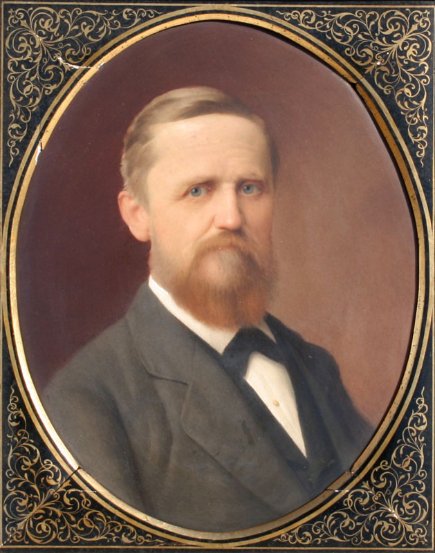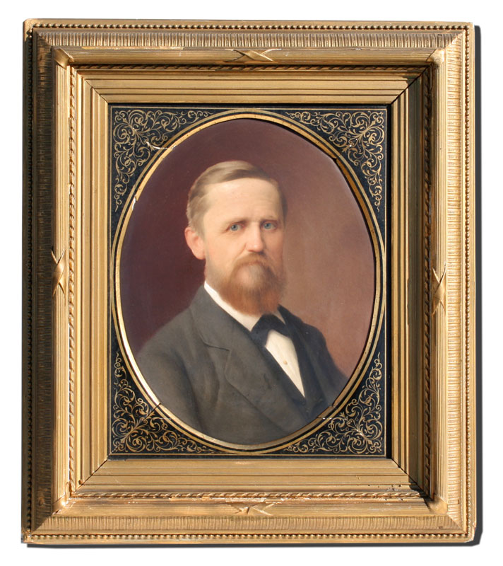 LARGE KPM PLAQUE OF HENRY WILLIAM FRIES: 17'' X 13 1/2'', period gilded gesso frame with wear and repair, 27'' X 23'', inscribed verso, impressed KPM mark. Fries was a very important Salem, N.C. businessman. He had been commissioner of the town of Salem, trustee of the Moravian Church, member of its synods, president of the Northwestern North Carolina Railroad, director of the North Carolina Railroad, director of the Wachovia Loan and Trust Company, director of the Fries Manufacturing and Power Company, vice-president of the Mayo Mills and connected with those of Avalon and Fries