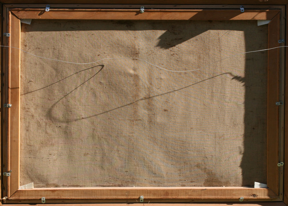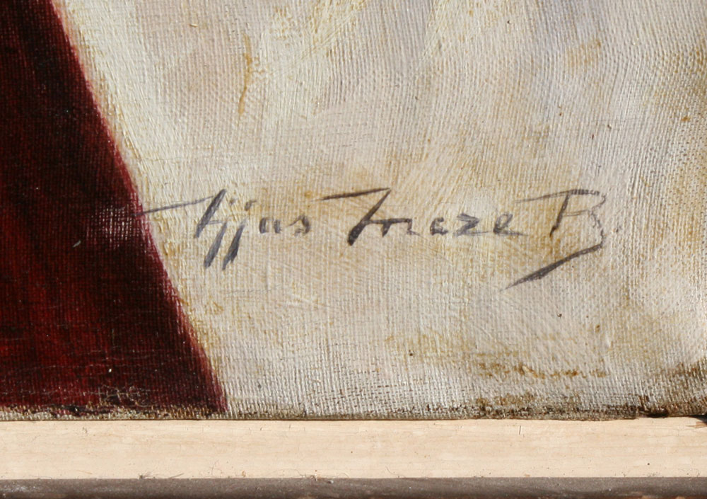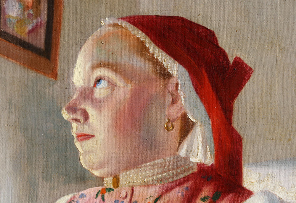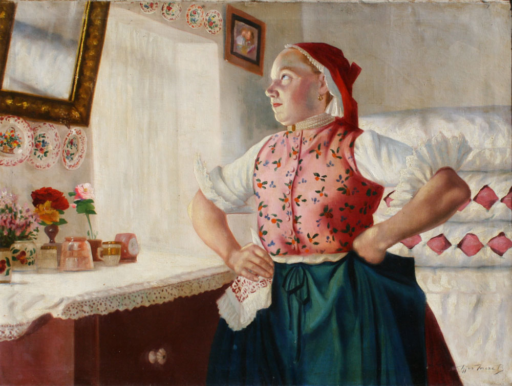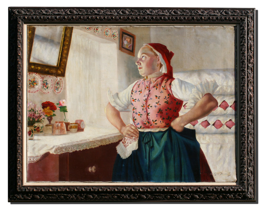 ILLEGIBLY SIGNED OIL ON CANVAS OF A LITHUANIAN? GIRL LOOKING AT HERSELF IN THE MIRROR WITH HANDS ON HIPS: 30'' x 39 1/2'' approximately, carved wood frame with wear, 38'' x 48''.