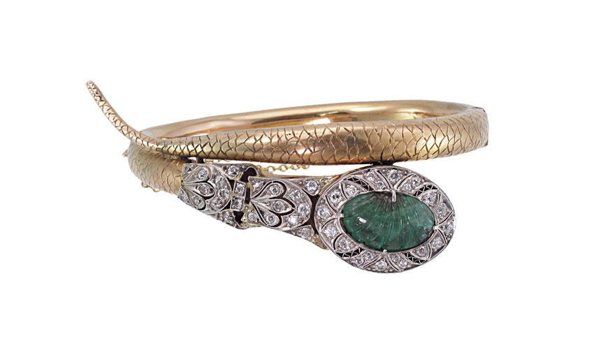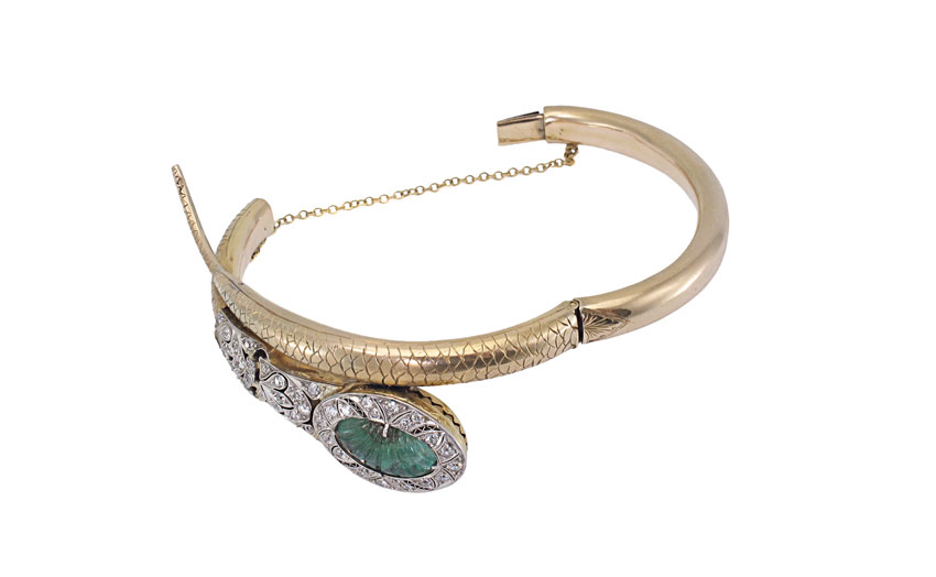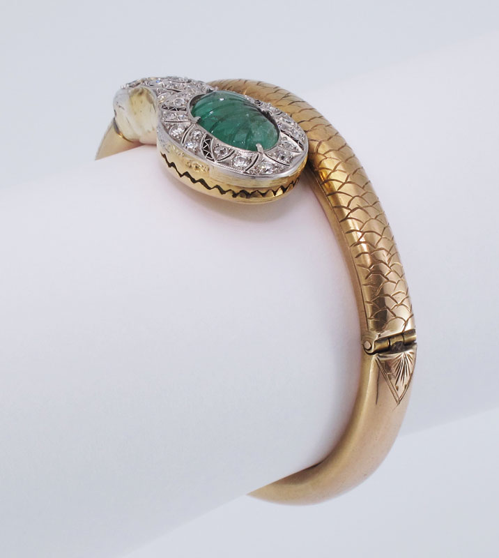 ANTIQUE EMERALD AND DIAMOND GOLD SNAKE BRACELET CA. 1910: 14K yellow gold hinged bangle snake bracelet with platinum top head and neck. The head is a carved emerald, 16 x 9.5 mm. The emerald is framed and the neck is covered in 42 Old European Cut Diamonds totaling approx. 1 Ct. rated SI1-2 in clarity and H-I on color. The body of the snake has reptile skin design. Safety chain. Weight 36.2 grams.