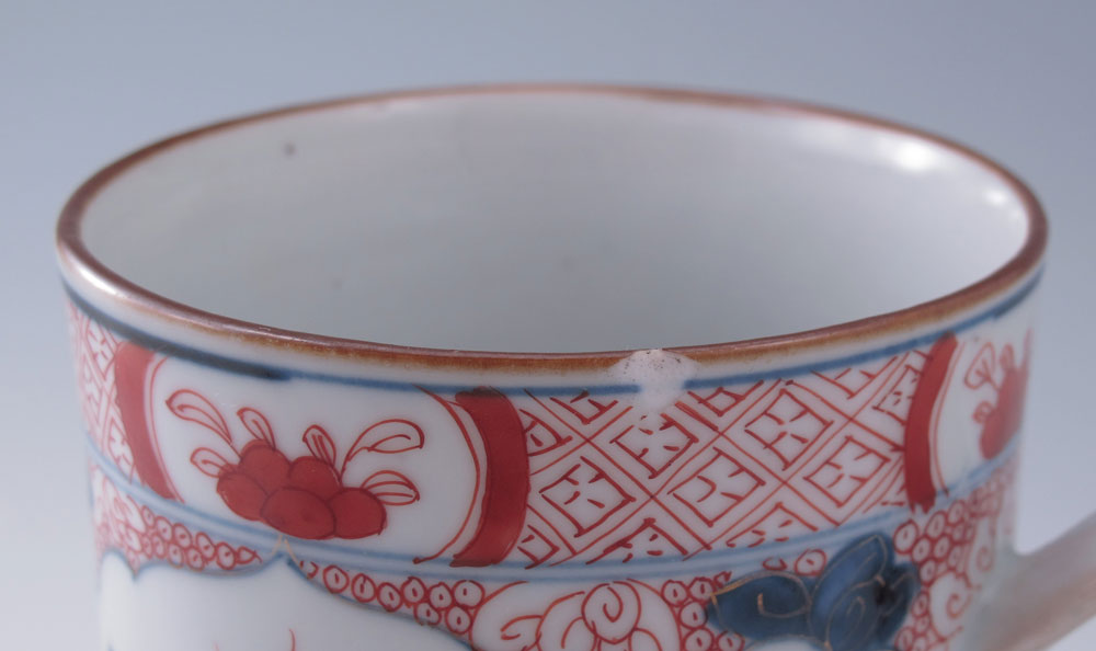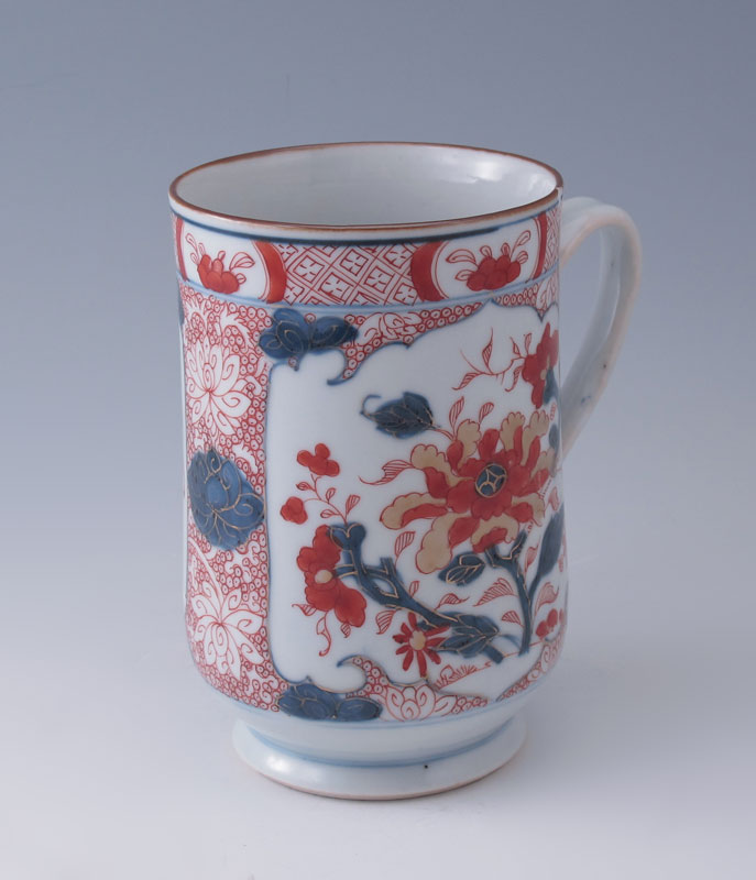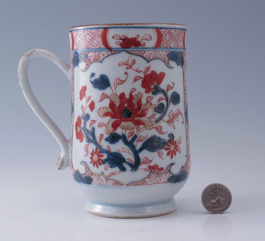 CHINESE IMARI MUG Ca 1760: Imari coloration of iron red, cobalt and gold. 6'' h x 3 3/4''