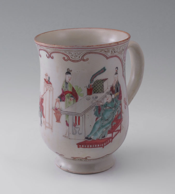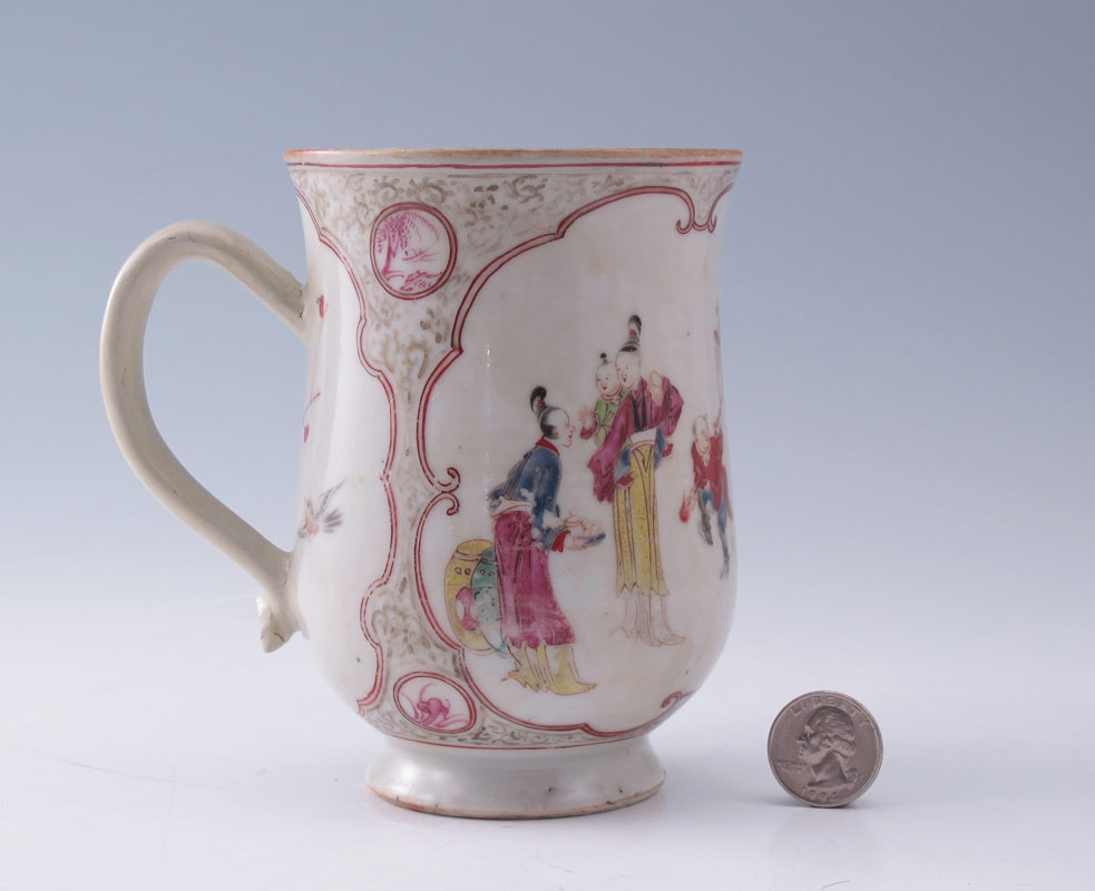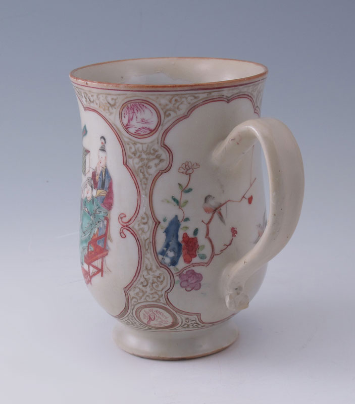 CHINESE EXPORT CIDER MUG: Hand painted social scene, 5 1/2'' x 3 3/4''.