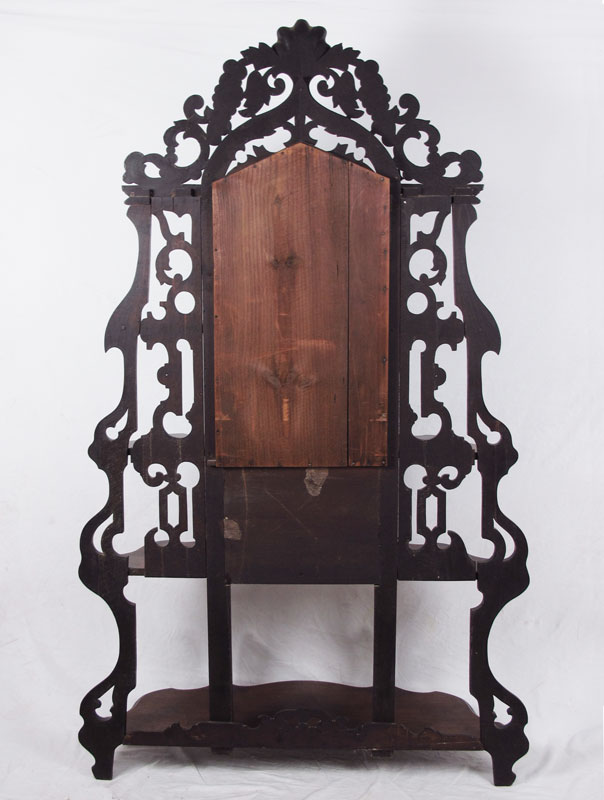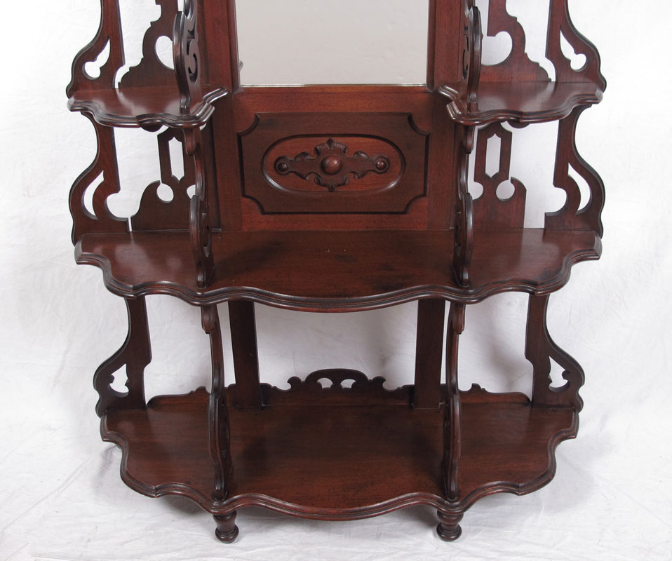 A GRAND VICTORIAN MIRROR ETAGERE: Carved crest with shell and grape vine motif over central mirror surmounted by 4 side shelves, all above 2 full length shelves. 80'' h. x 49'' x 14 1/2''.