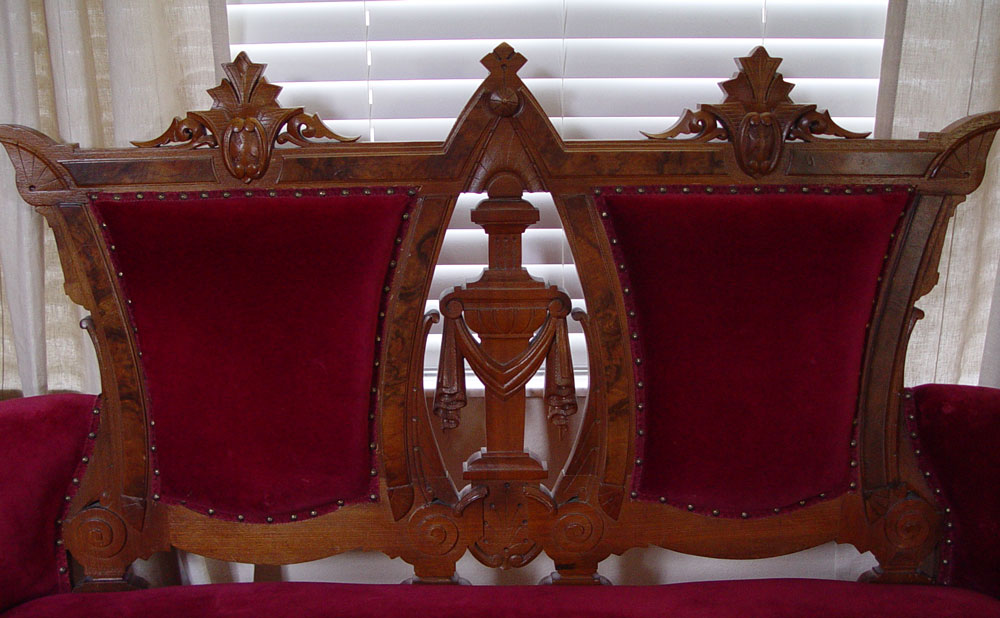 CARVED VICTORIAN SETTEE: Carved and shaped back and arms with burl veneer accents. Deep rose color velvet upholstery. 43 1/2'' h. x 67 1/2'' x 26 1/2''