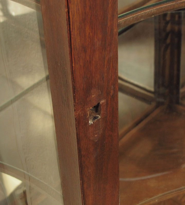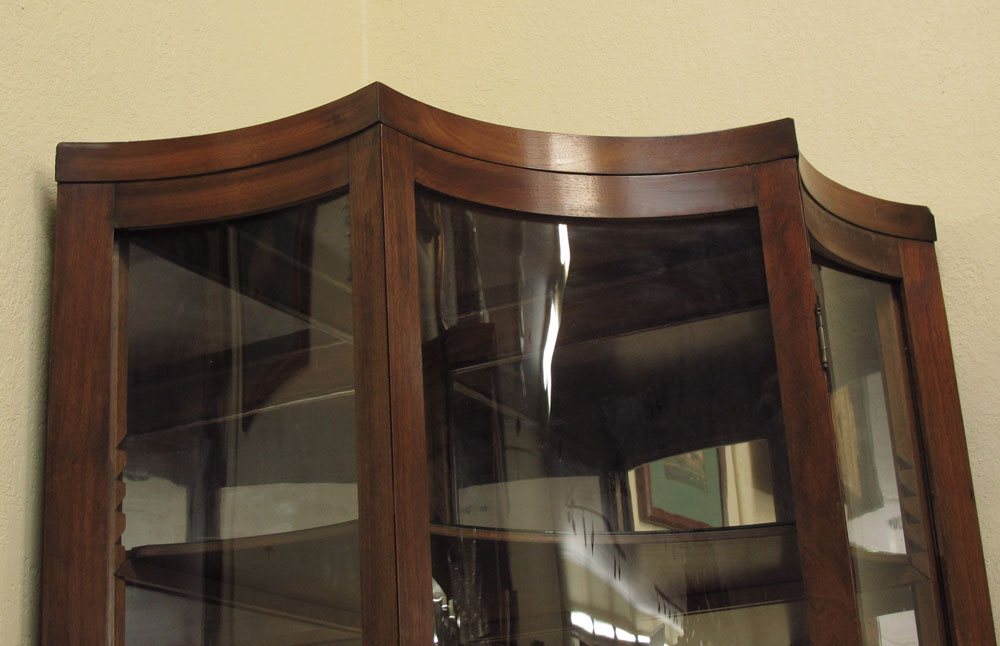 A UNIQUE FORM CORNER DISPLAY CABINET: Curved and angled 3 glass front with 3 adjustable shelves and mirrored back, on carved and turned legs. 71 1/4'' x 41 1/2'' x 30''