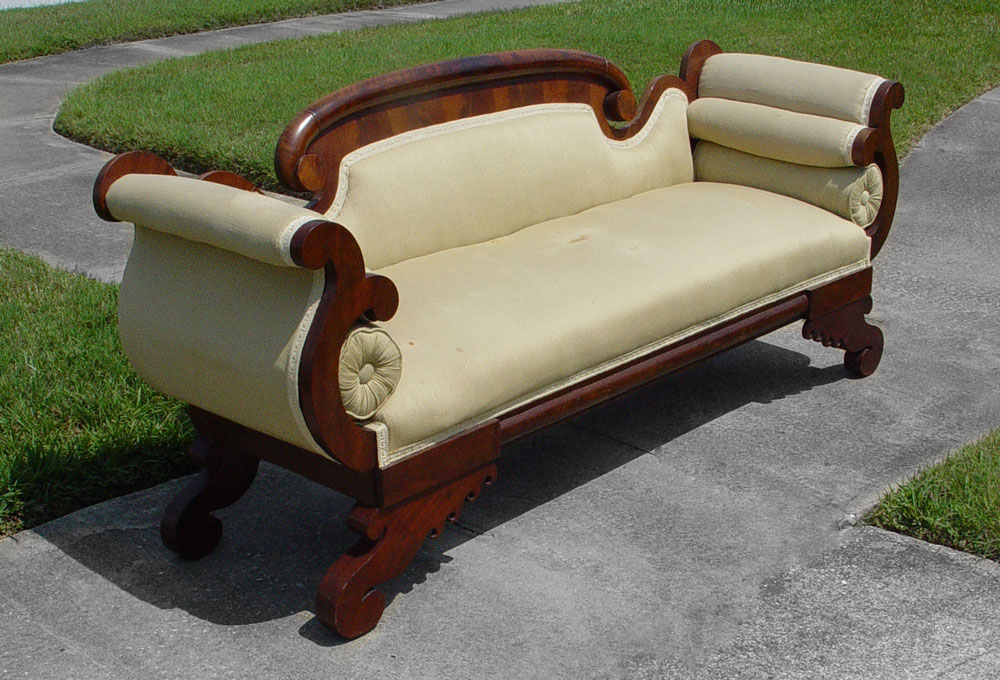AMERICAN EMPIRE PERIOD SOFA: Carved and shaped back with double scroll arms, carved and shaped feet. 35 3/4'' h. x 79 3/4'' x 26''.