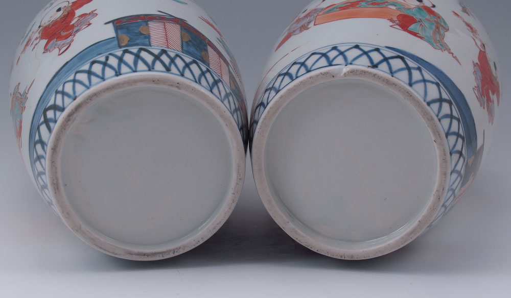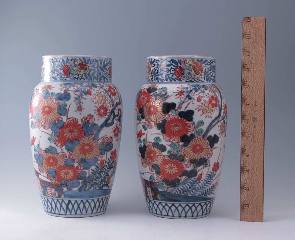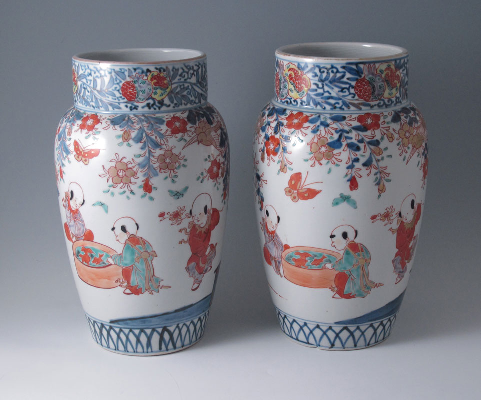 PAIR OF JAPANESE IMARI VASES: Featuring scene of children at a koi pond and at play, flowers, birds and butterflies. Gilt decoration on rim. 9 3/4'' h. x 5 1/2'' dia.