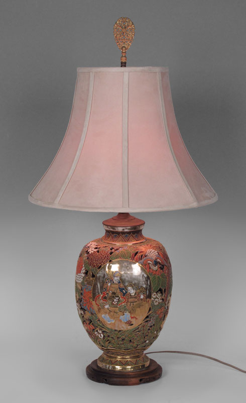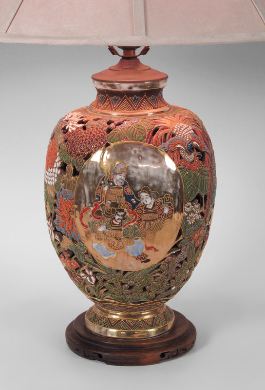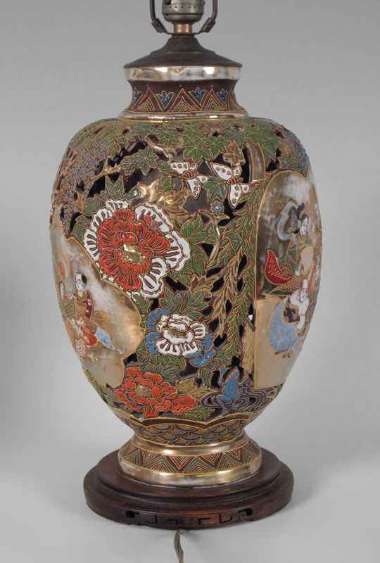 JAPANESE SATSUMA LAMP: Reticulated earthenware body decorated with moriage, lamp 31'' h. overall, porcelain 13''h x 8''.