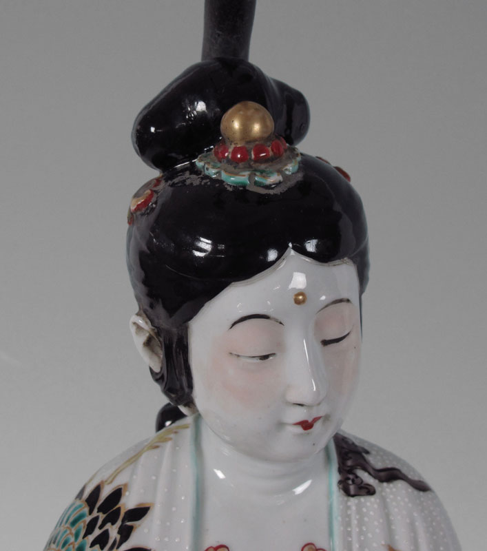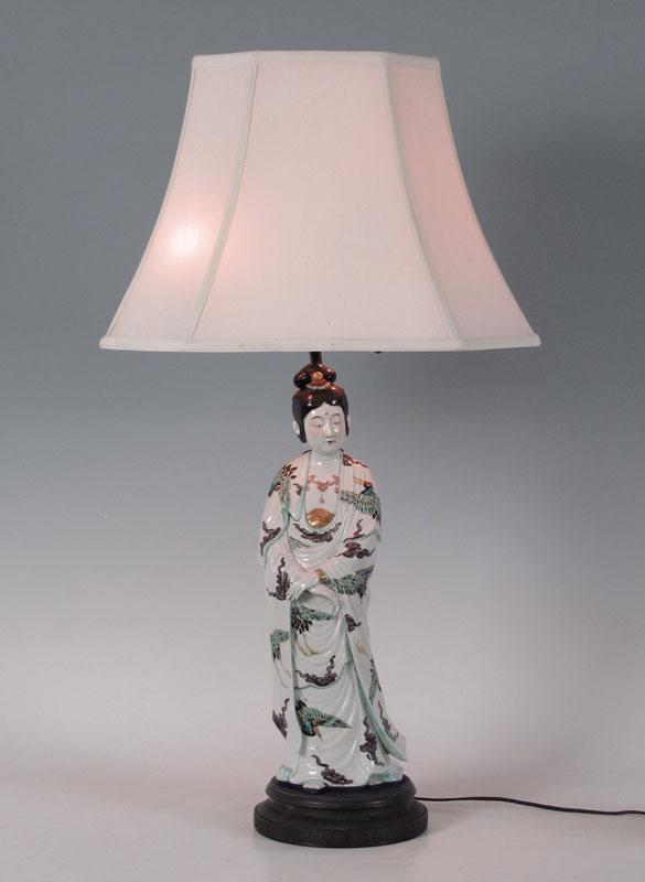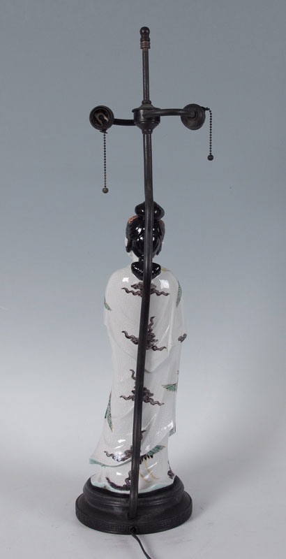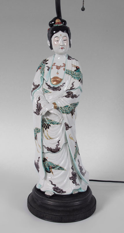 FIGURAL JAPANESE PORCELAIN LAMP: Beautiful figure with cranes decorating her robe. Porcelain measures 18'' h., the lamp 32'' overall.