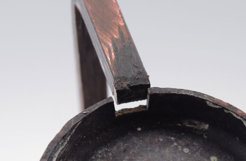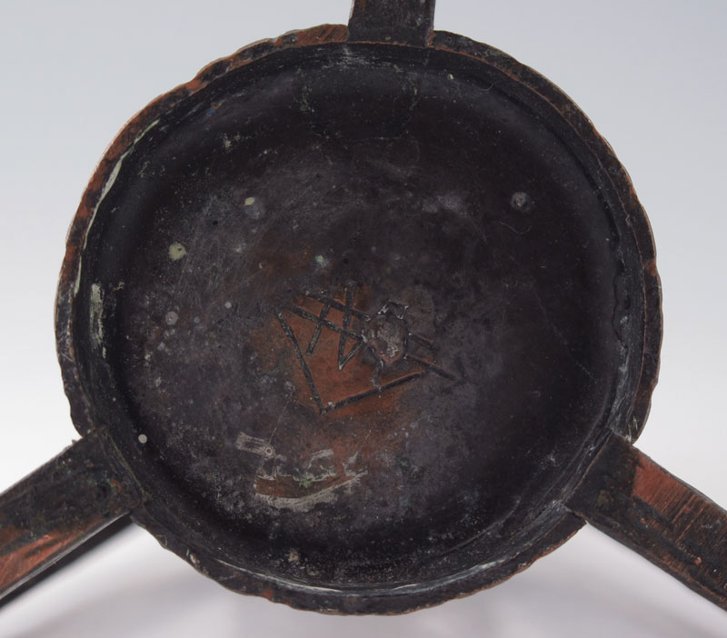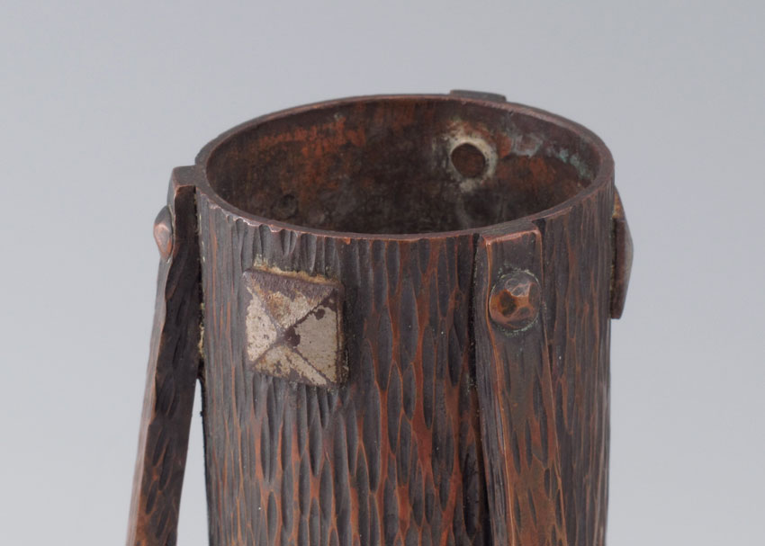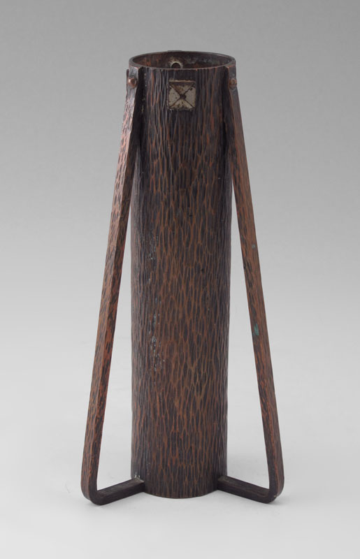 ARTS AND CRAFTS METAL VASE: Cylindrical form, tree bark texture, illegible backstamp. 7 3/4'' tall.