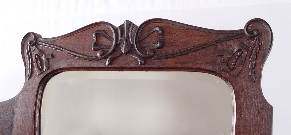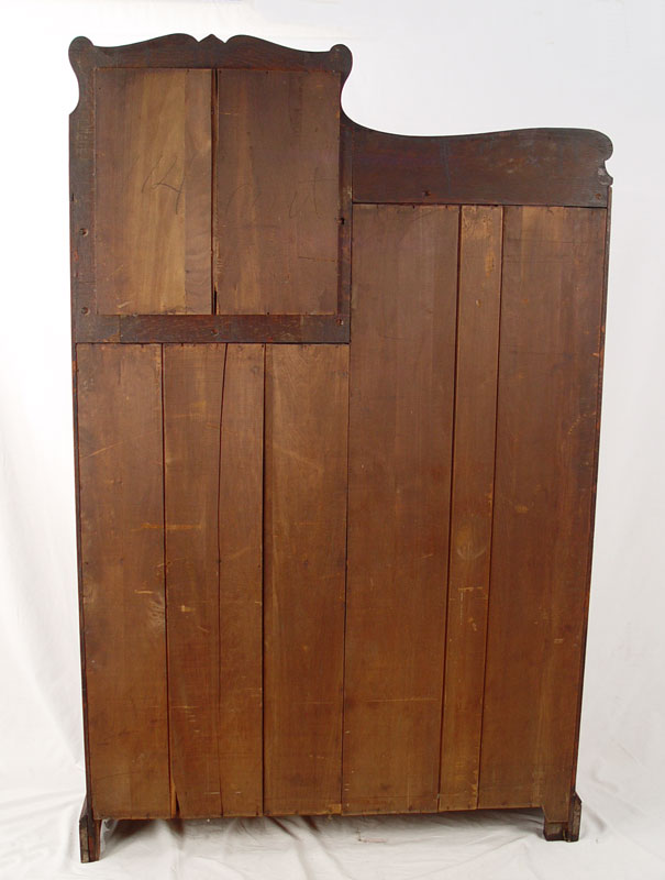 LATE VICTORIAN OAK SIDE BY SIDE SECRETARY BOOKCASE: 6 ft. tall with fall front desk, beveled mirror and drawers side by side with a glass front bookcase. 45 1/2'' wide x 13 1/2'' deep.