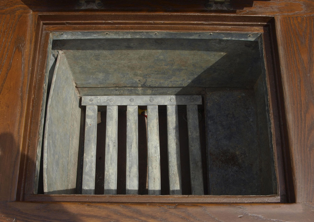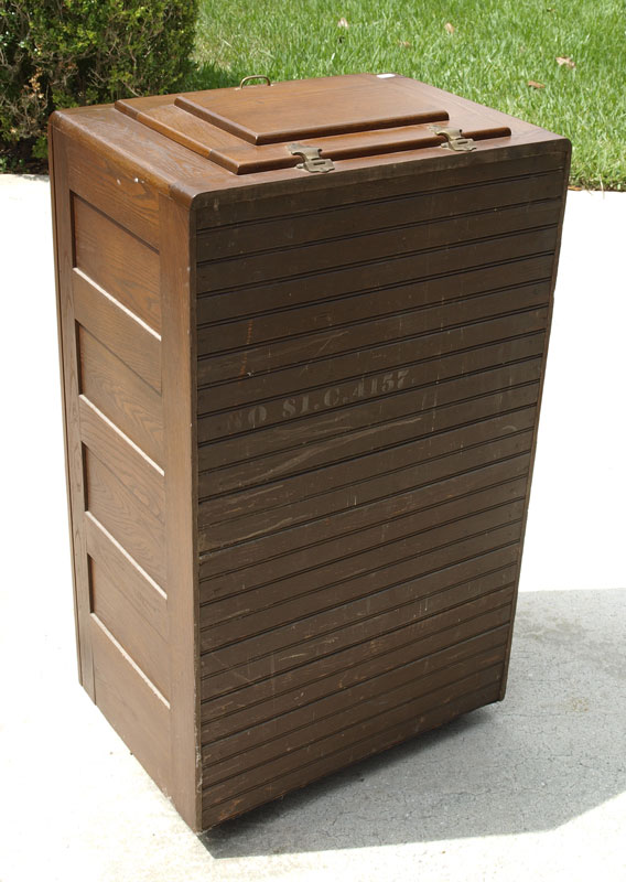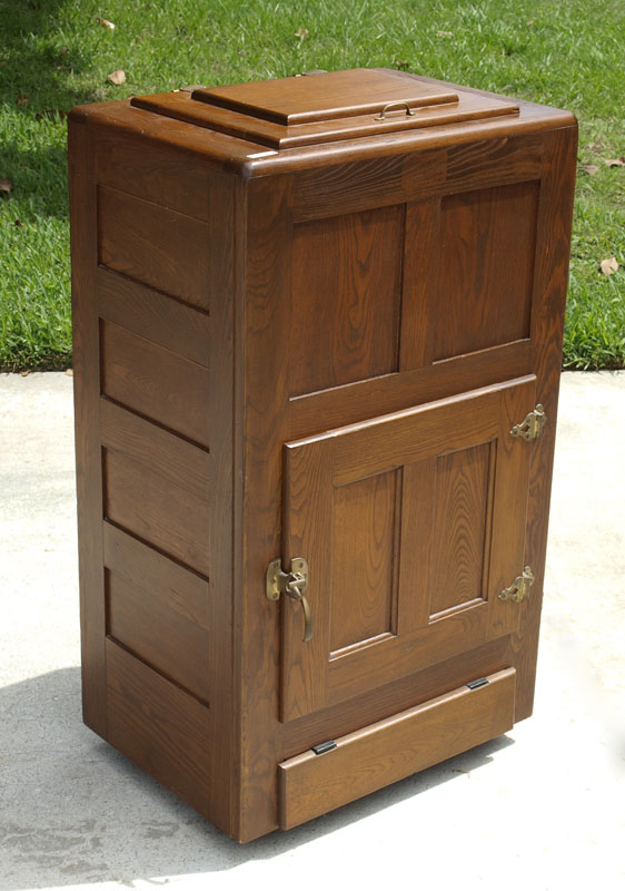 GOLDEN OAK ICE CHEST: Hinged lift top with hinged front door. Unmarked as to maker. 42 3/4'' h. x 24'' x 17''.