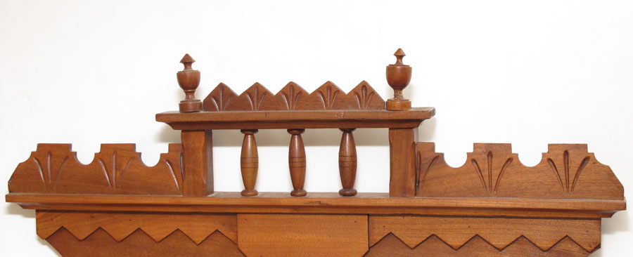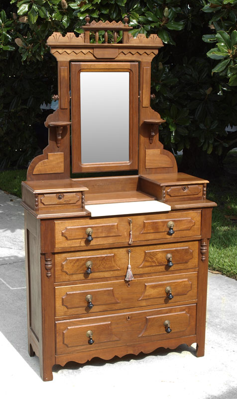 RENAISSANCE REVIVAL VICTORIAN DRESSER WITH MIRROR: Traditional Victorian style with carved gallery over articulated mirror, 2 candlestands, 2 glove boxes, marble shelf over 4 drawers with door knocker pulls. 80'' h. x 42'' x 18 1/2''.