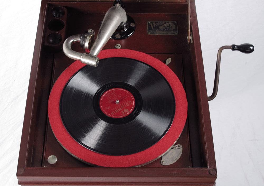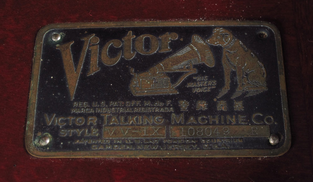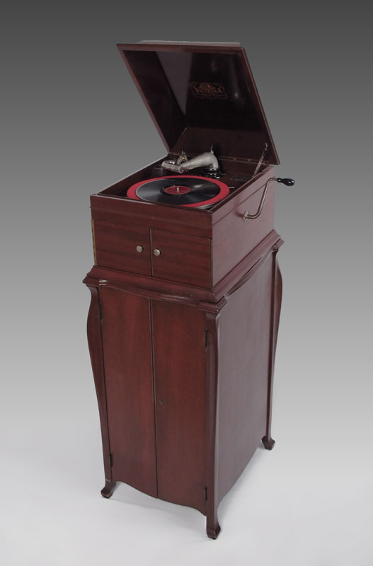 MAHOGANY VICTROLA VV-IX WITH STAND & RECORDS: Mahogany case table top model VV-IX sold with Mahogany floor stand and approx. 51 records from differing eras. Victrola measures 13 3/4'' h. x 16 3/4'' x 20 1/2''. Floor stand measures 34 1/4'' x 17 3/4'' x 21 1/2''.