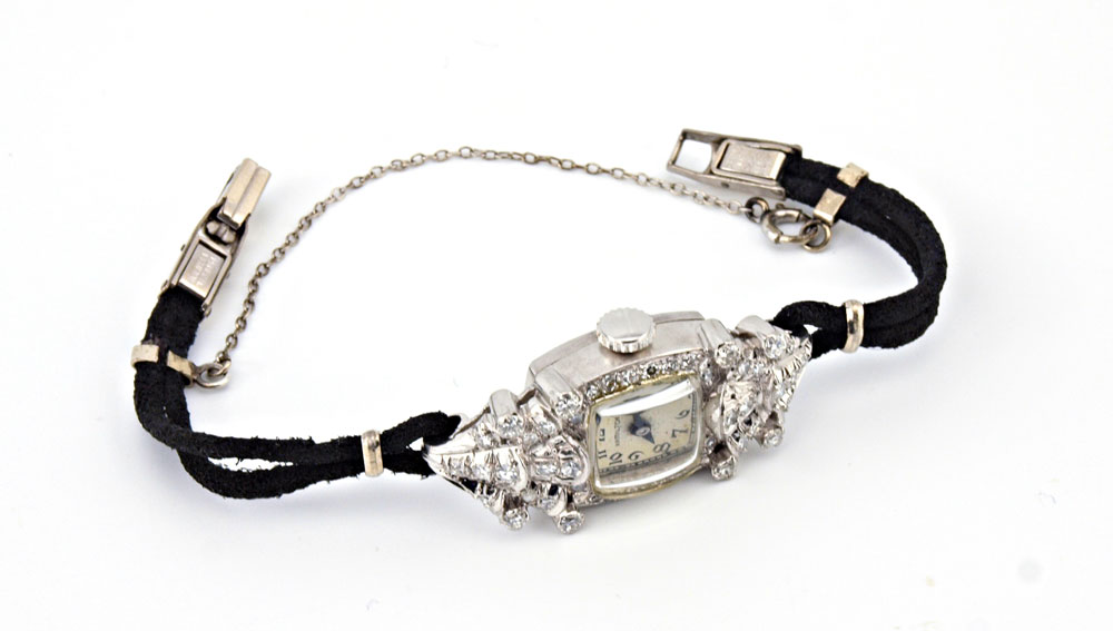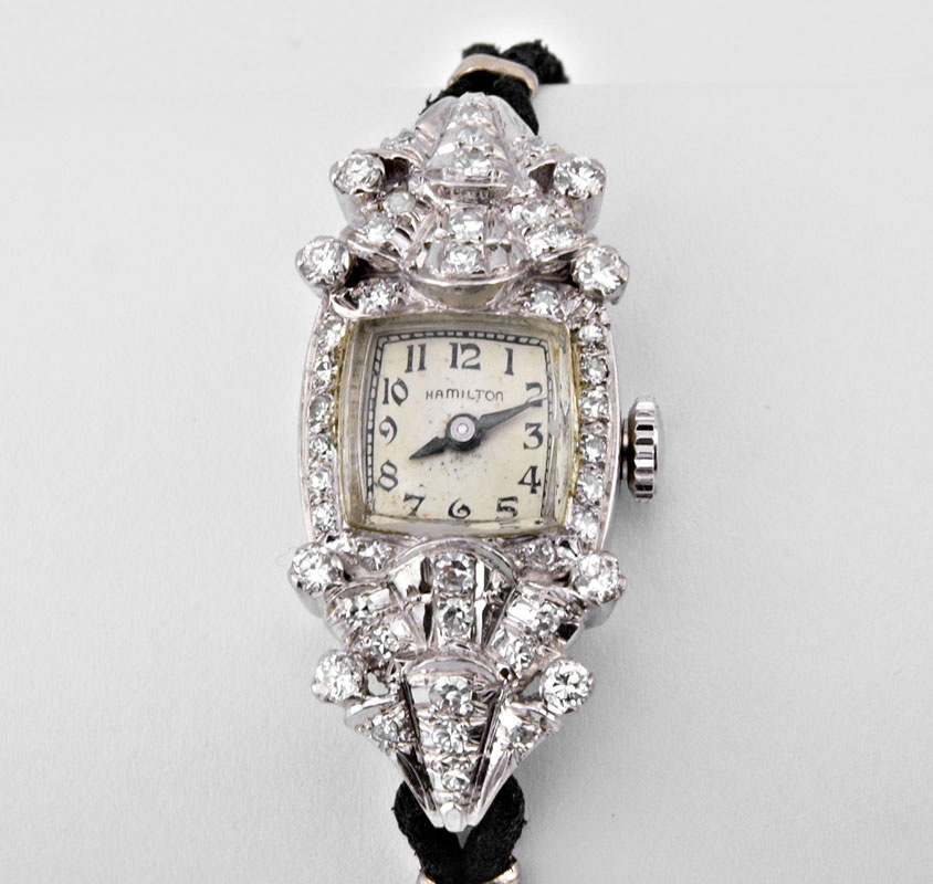 PLATINUM DIAMOND WRISTWATCH: Platinum lady's Hamilton wristwatch contains 34 round single cut and brilliant cut diamonds. Weight: 1.00 Ct. Approx. Rated VS in clarity and G-H in color. The diamonds are prong set. Mechanical movement is running. Black cord bracelet. 6'' in length. Weight: 17.7 grams.