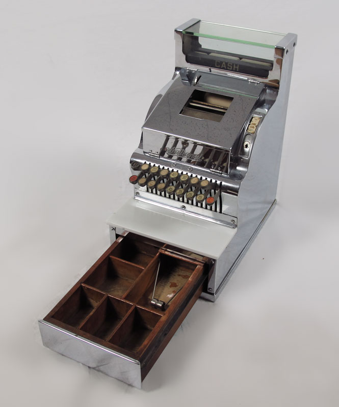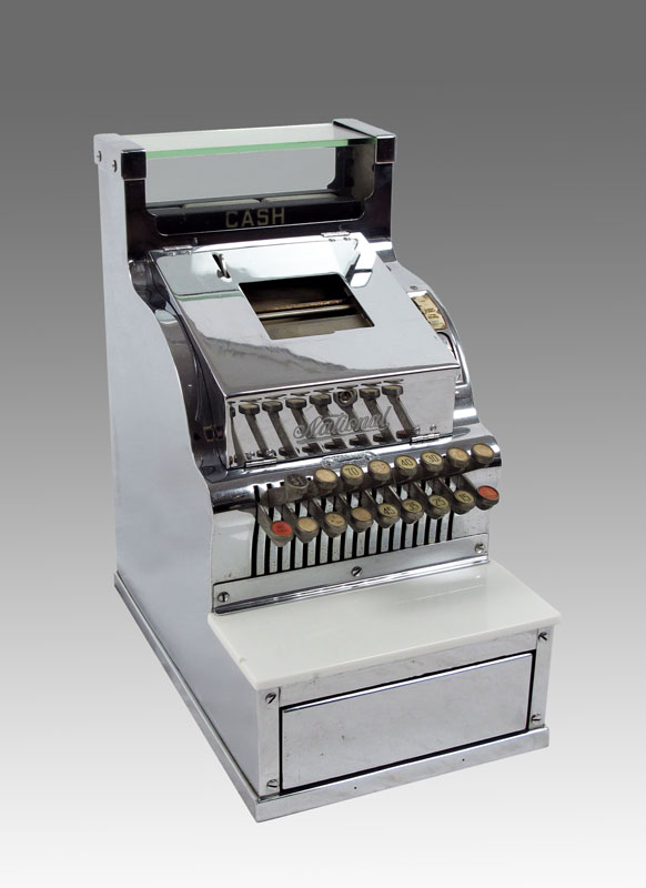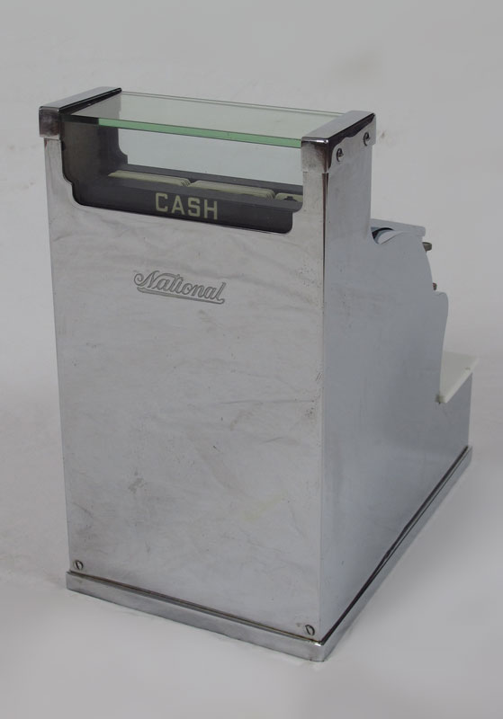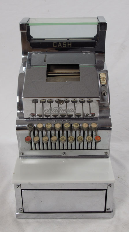 1932 CHROME CANDY NATIONAL CASH REGISTER RA-132: Chrome exterior with marble shelf, keys from 5 cents to $1. Serial number 3281058 which dates to 1932. Missing key for drawer lock. Measures 18 1/2'' h. x 10 1/2'' x 16 1/2''.