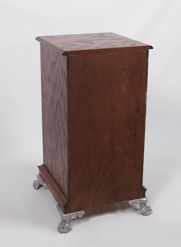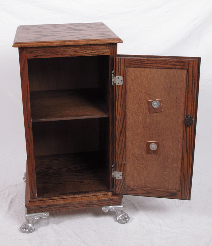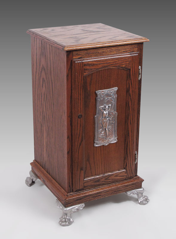 ART NOUVEAU OAK SLOT MACHINE STAND: Single door with single interior shelf. Silver toned cast metal feet and applied Art Nouveau style plaque on door. 34 1/4'' h. x 20'' x 20''