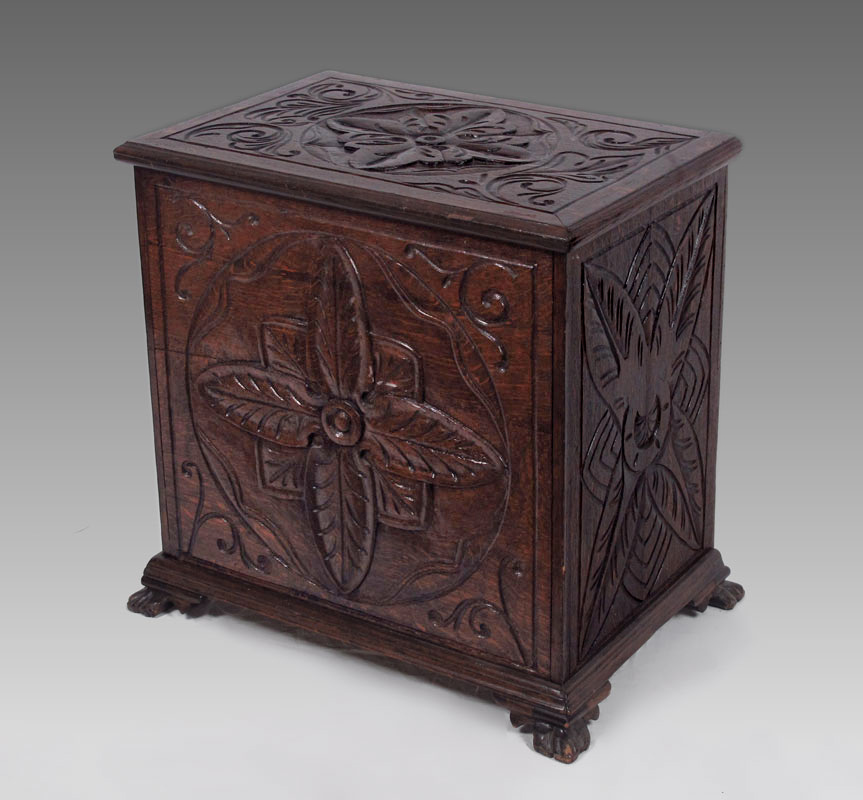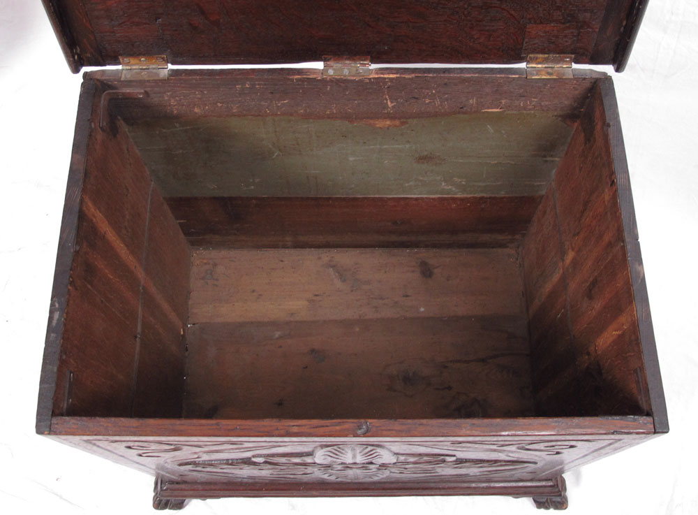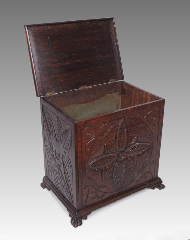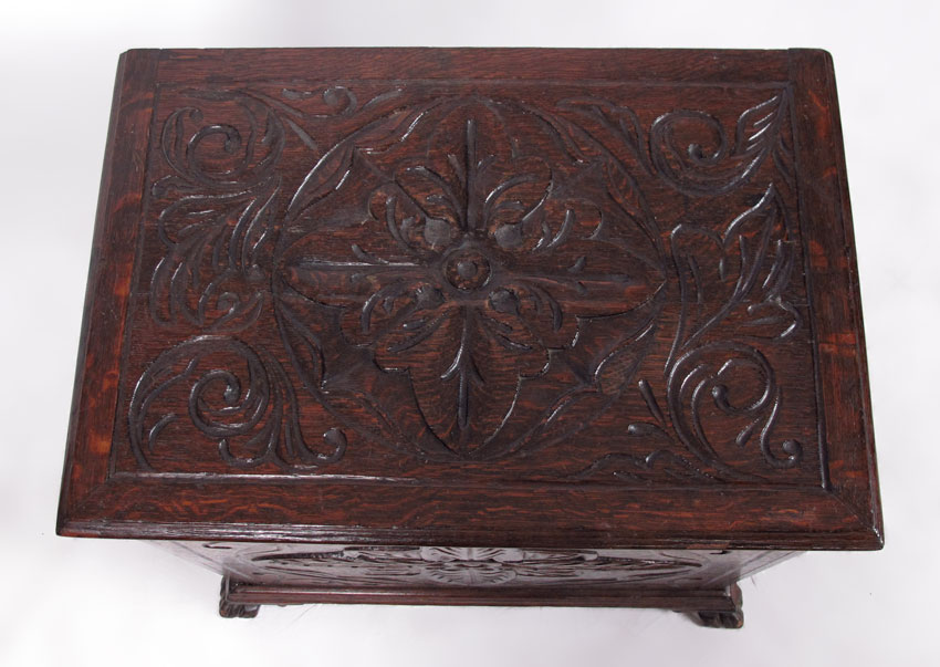 HEAVILY CARVED OAK LIFT TOP CHEST: Victorian carved chest with hinged lift top lid on paw feet. 27 3/4'' h. x 29 1/2'' x 20''.
