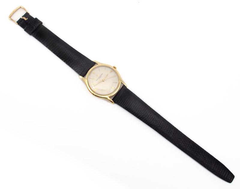 18K GOLD VACHERON & CONSTANTIN ULTRA THIN DRESS WATCH: Fine Swiss watch from the oldest watch manufacturer in the world. The serial number of the case is 364812, case measures 38.8 mm lug to lug and 32.4 mm wide. 18 jewel movement in good running order. Original dial with standard stick hands. Gross weight 34.4 grams, estimated weight of case 7-9 grams.