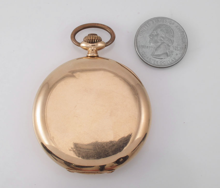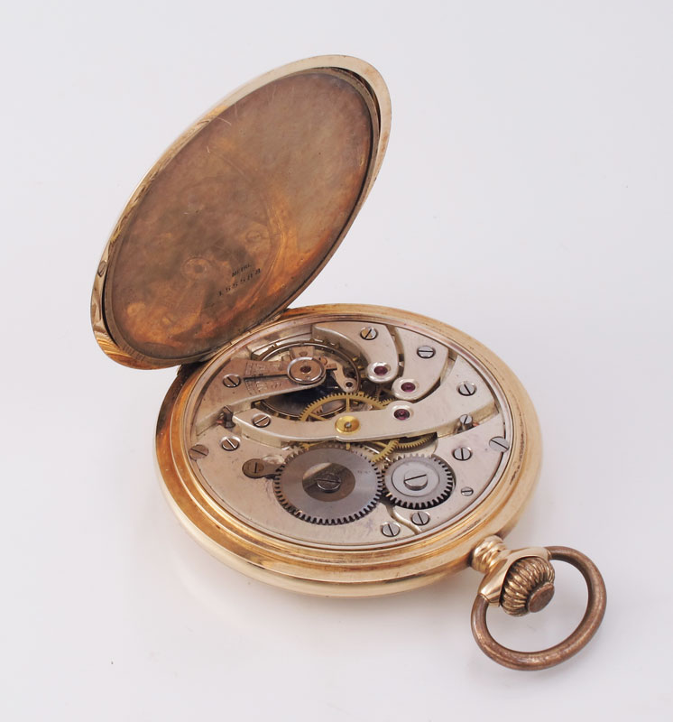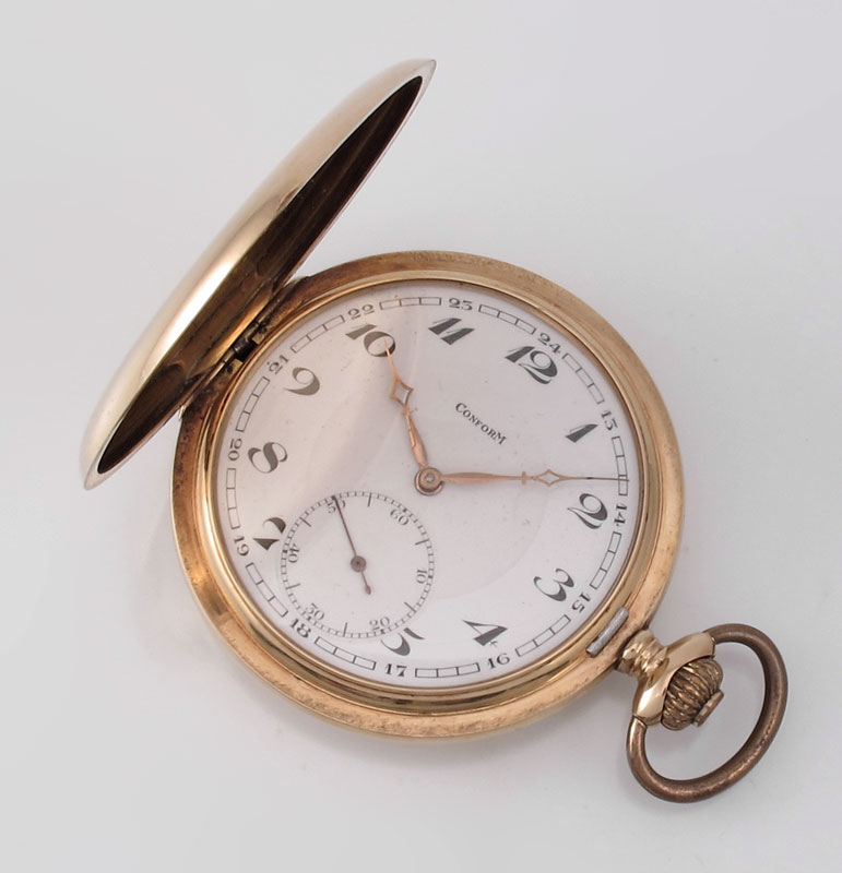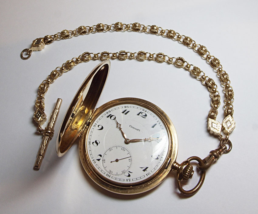 ANTIQUE 14K GOLD CONFORM POCKET WATCH AND CHAIN: 14K yellow gold British made hunters case pocket watch, serial number 15588. 15 jewel movement in good running order. Original dial, moon style hands. The 14K gold (assayed) chain weighs approx. 31.5 grams, with gold filled swivel. The gross watch weight approx. 80.7 grams. Case has base metal inside lid.