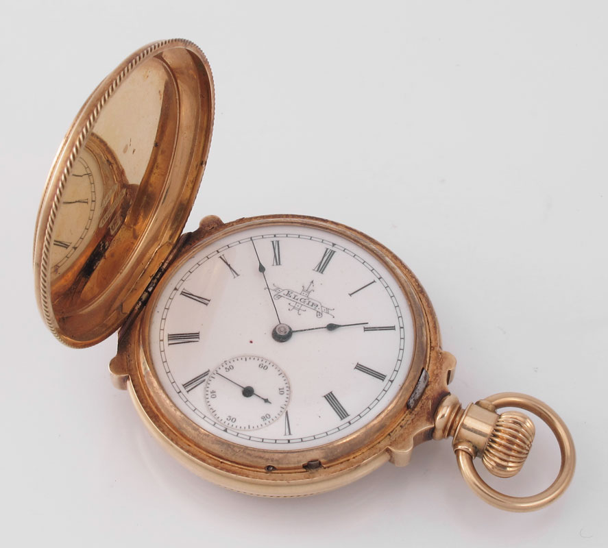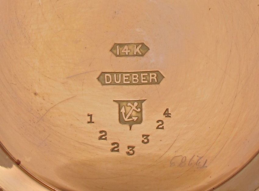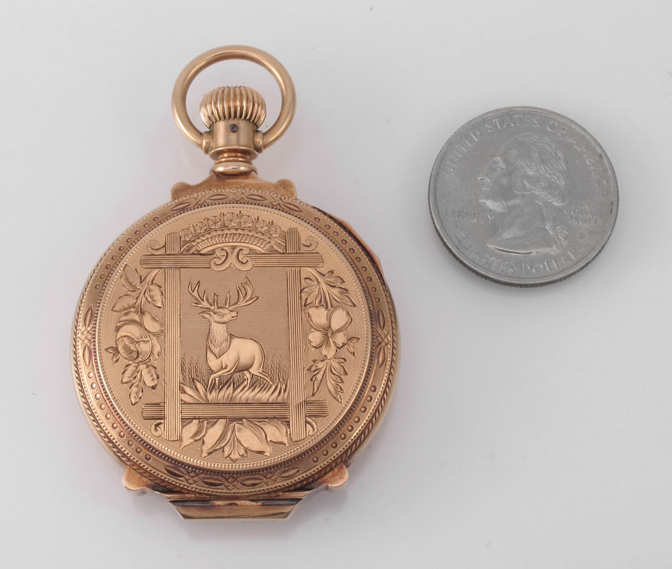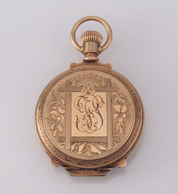 ANTIQUE 14K GOLD DEUBER POCKET WATCH CA. 1888: Ornate 14K yellow gold hunters style box case, serial number 1223324. 15 jewel, size approx. 0, Elgin movement in good running order, serial number 3081419. Original dial with spade style hands. Gross weight 31.7 grams. Estimated weight minus movement, crystal and springs, 30 grams. Assayed.
