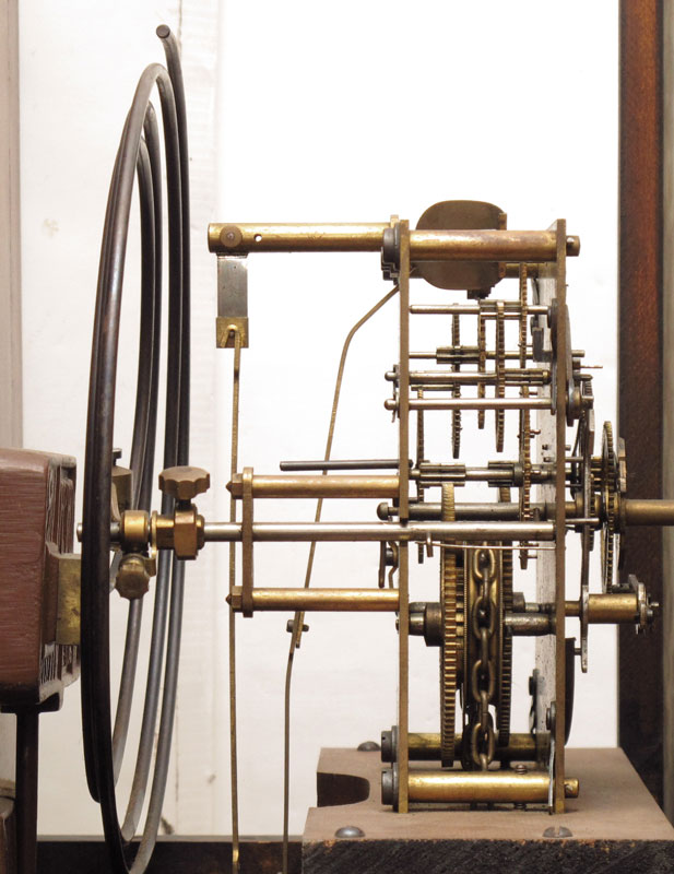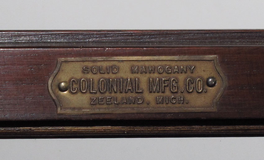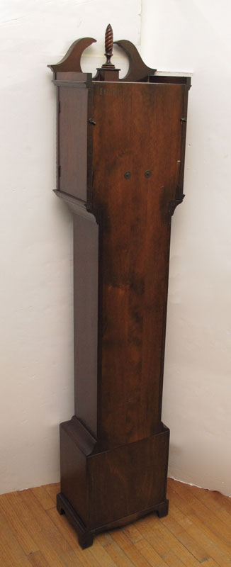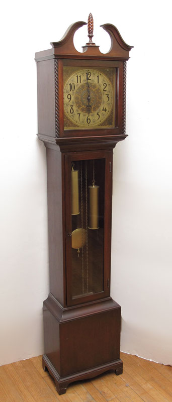 COLONIAL MFG MAHOGANY GRANDMOTHER CLOCK: Mahogany case with broken arch pediment with spire finial, spiral half column accents on bonnet. Mixed metal face with Arabic numerals. Mauthe Germany weight driven movement with Echo gong. 79'' h. x 16 1/2'' x 10 1/2''.